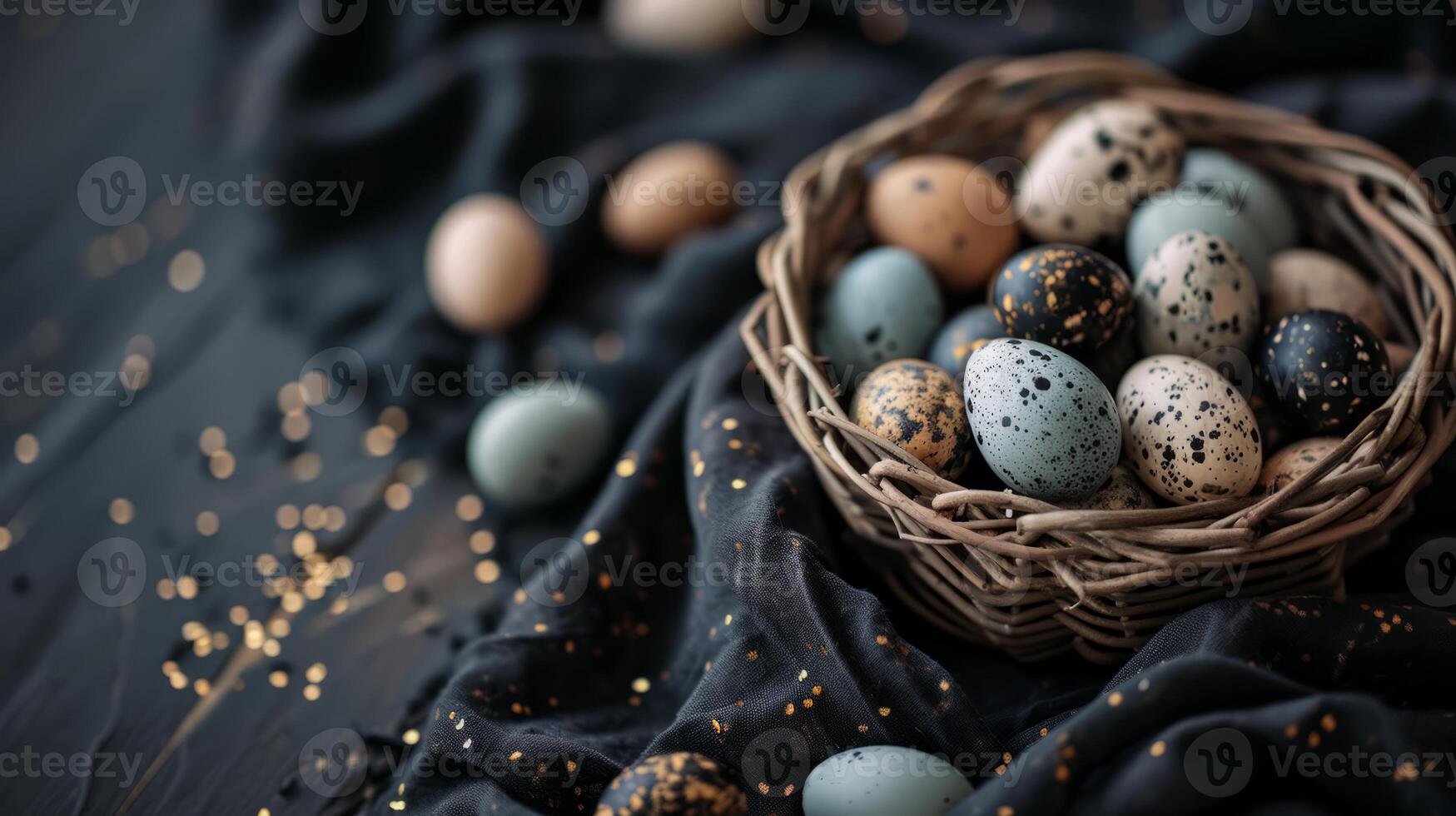 AI generated A basket filled with small speckled eggs on top of a black tablecloth covered tablecloth with gold flecks on it and a black background Pro Photo