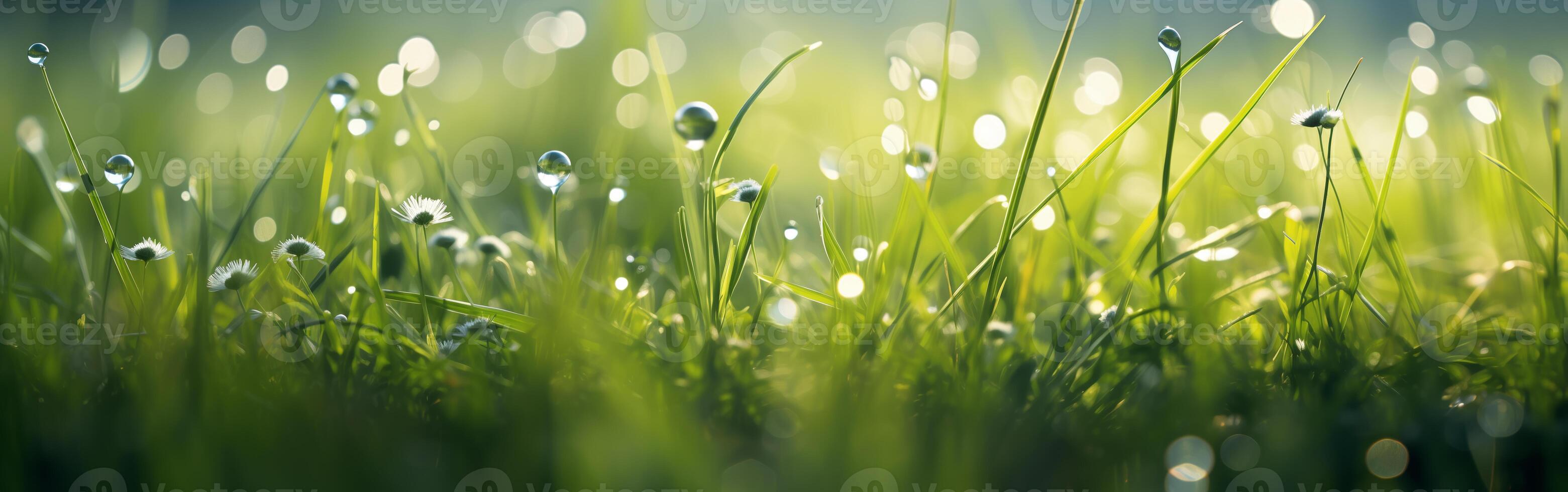AI generated grass close-up with drops of dew in the background bokeh and rays of light Pro Photo