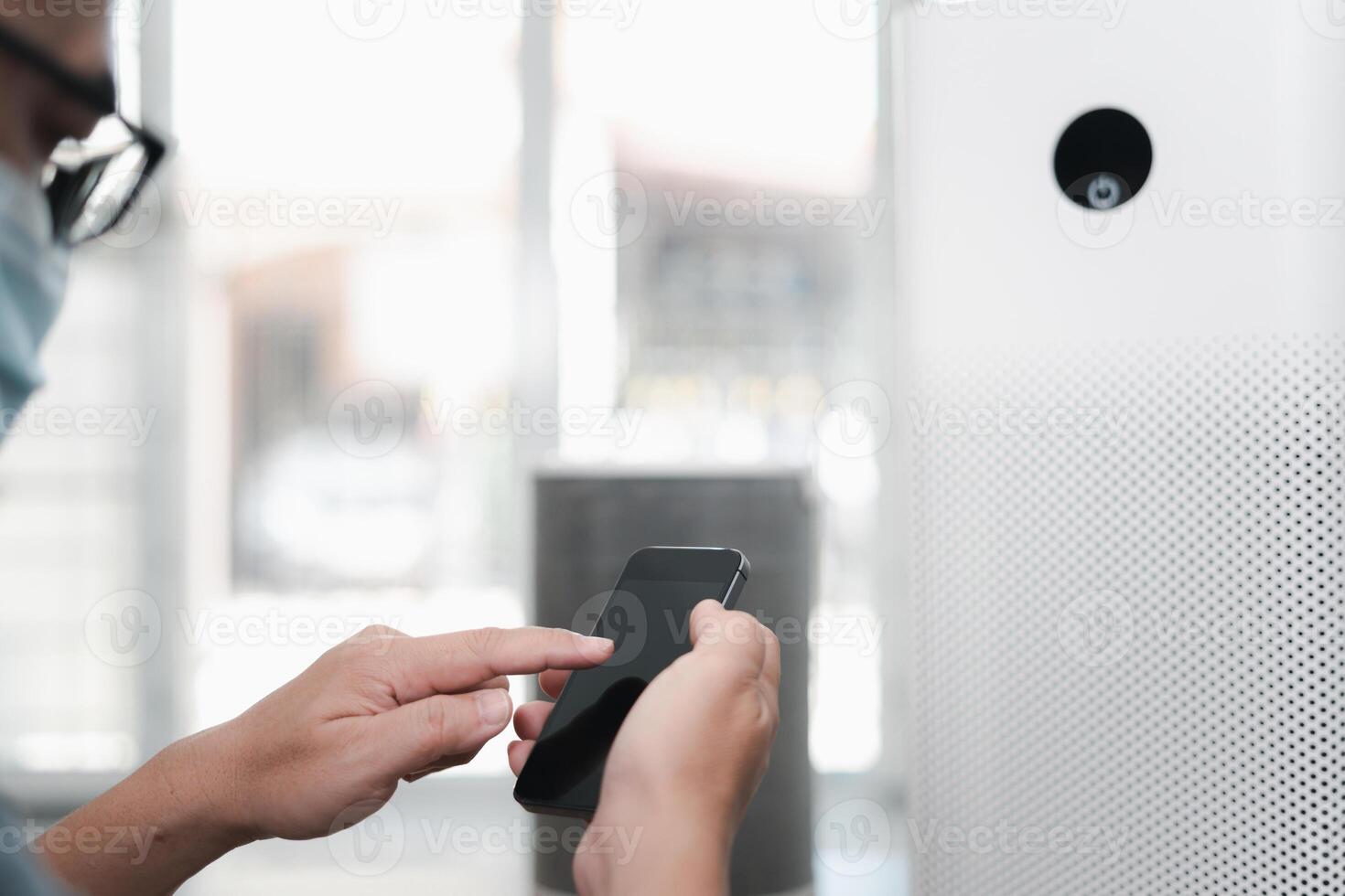 Close up hand a man hold smartphone and use Application for control Air purifier in home network remote device control on internet Pro Photo