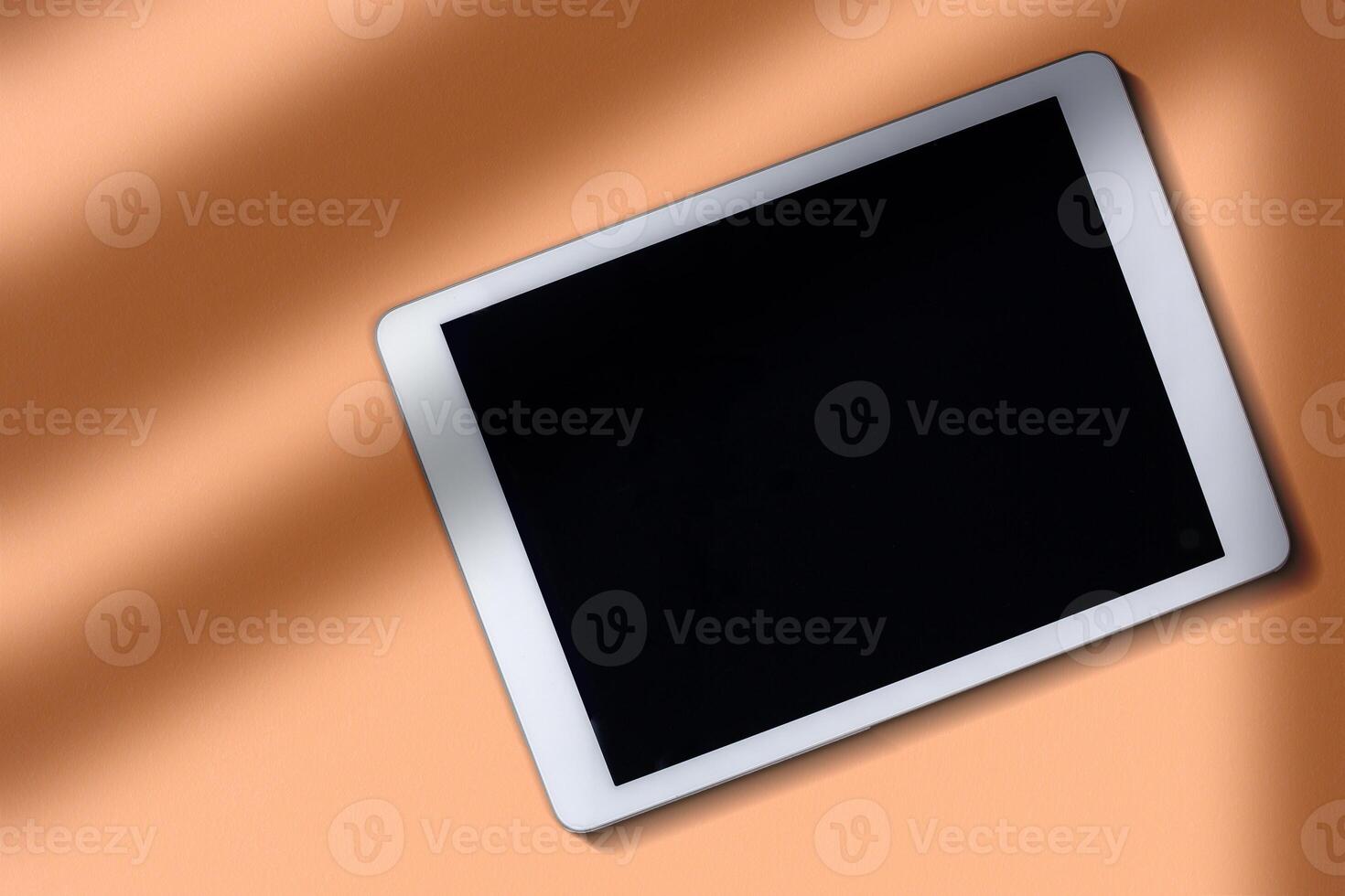 Digital tablet mockup screen over plane surface on Peach Fuzz color of the year. Top view header with copy space and blank screen. Pro Photo