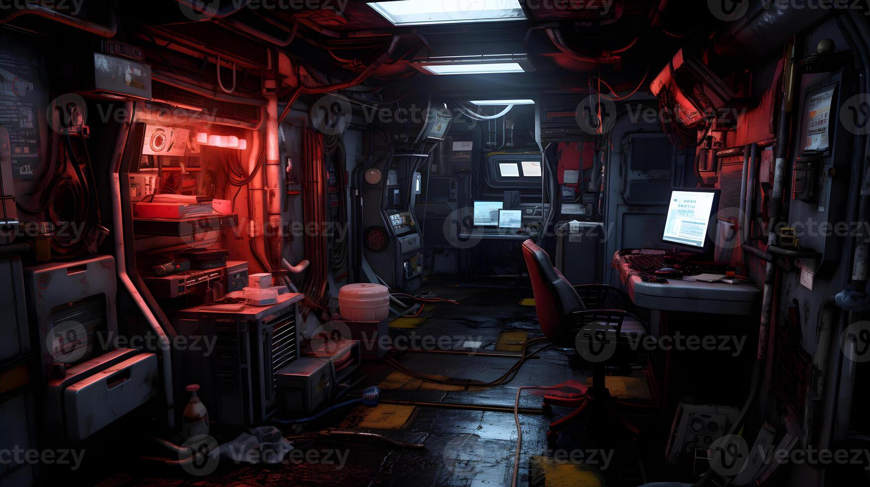 AI generated Messy and dark cyberpunk hacker hideout room. Neural network generated image Pro Photo