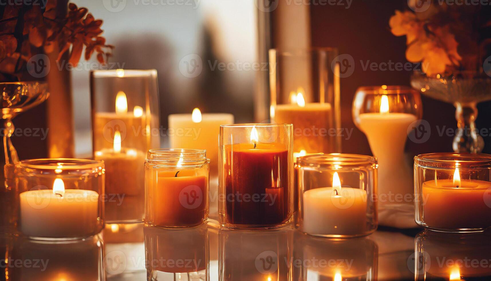 AI generated A serene setting of lit candles with glass container casting a warm glow, creating a cozy atmosphere. Pro Photo