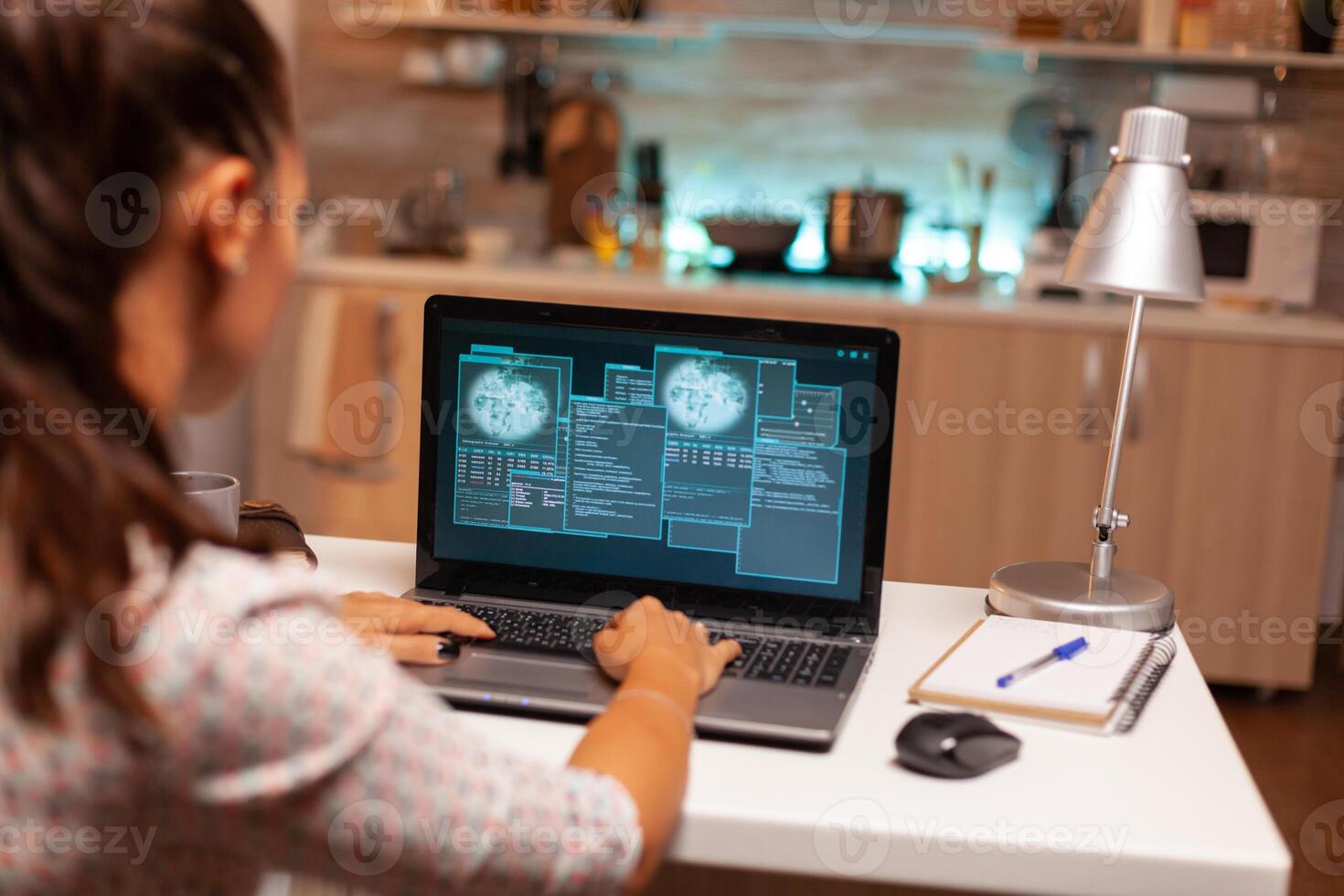 Female hacer cracking security firewall late at night from home. Programmer writing a dangerous malware for cyber attacks using performance laptop during midnight. Pro Photo