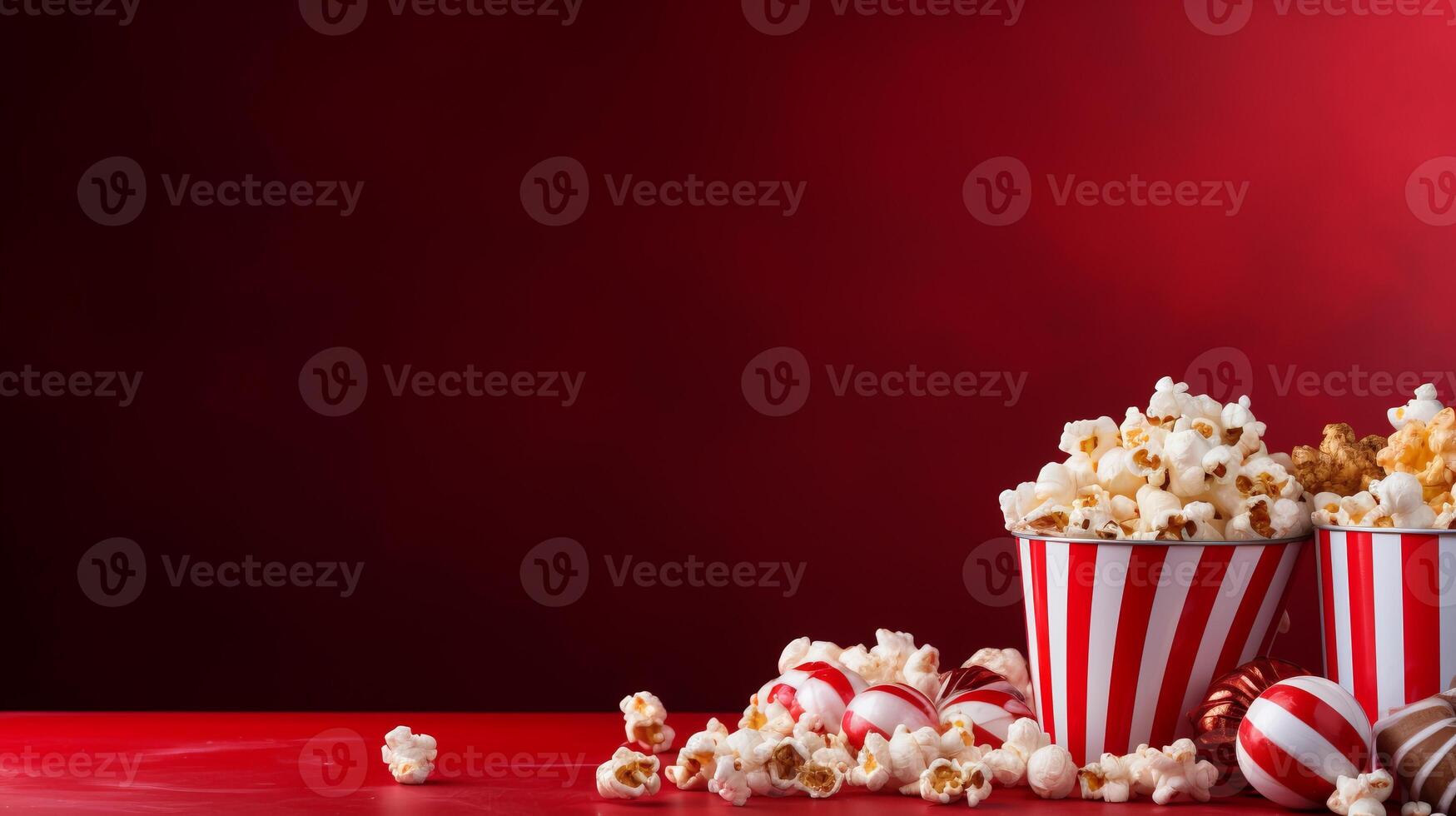 AI generated Striped popcorn box with delicious popcorn on red gradient background, ample empty space for copy Pro Photo