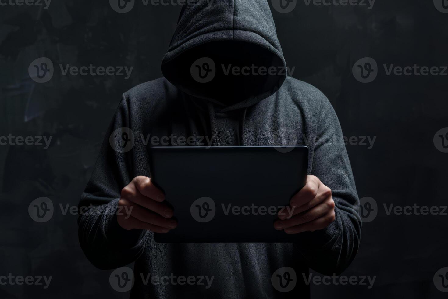 AI generated Computer hacker in hoodie with obscured face. Hacker attack, dark web and cyber security concept. Generative AI Pro Photo