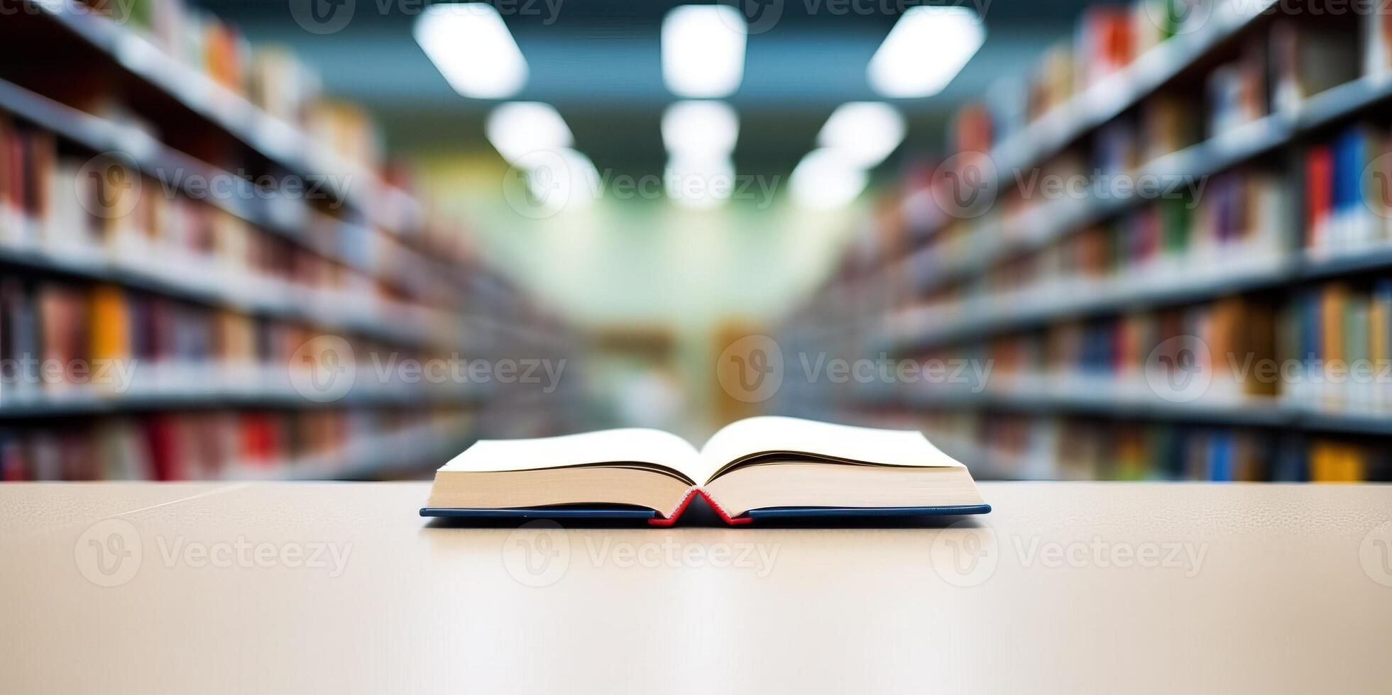 AI generated An open book on a table in a library with shelves of books in the background Pro Photo
