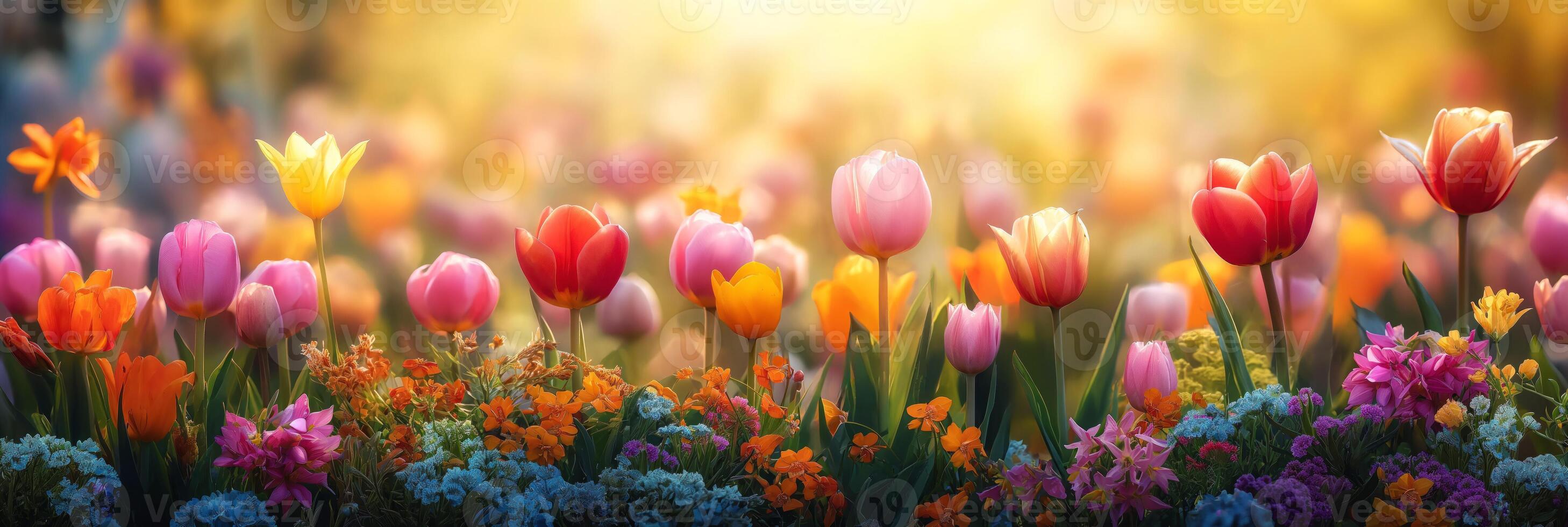 AI generated A springtime banner of field filled with a variety of flowers like tulips, daffodils, and cherry blossoms, in an array of bright pinks, yellows and purples. Pro Photo