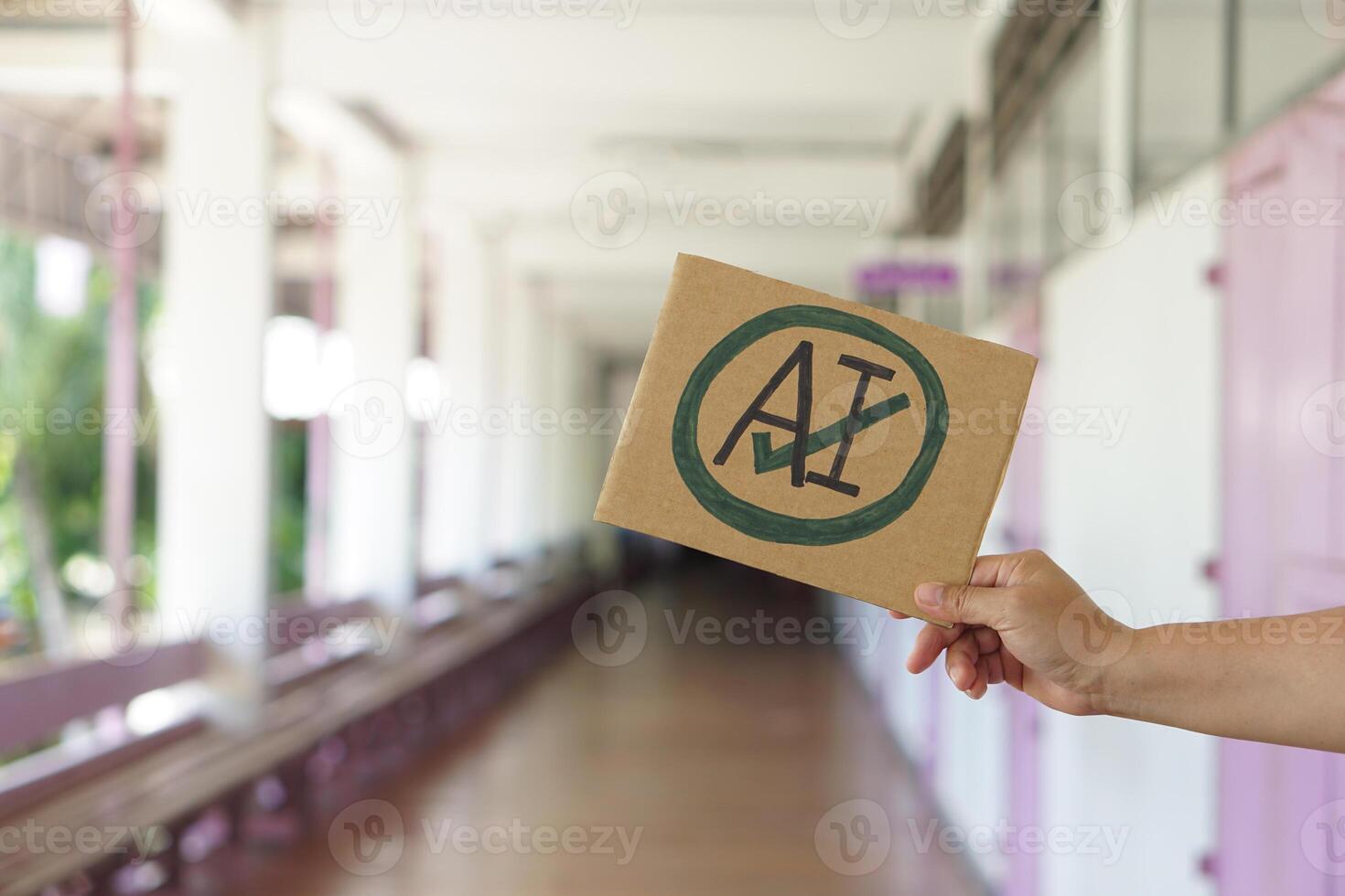 Close up hand holds paper card with drawn sign AI in circle and tick mark. Concept, Choose ,agree and accept to use AI or Artificial Intelligence to apply in daily life. Pro Photo