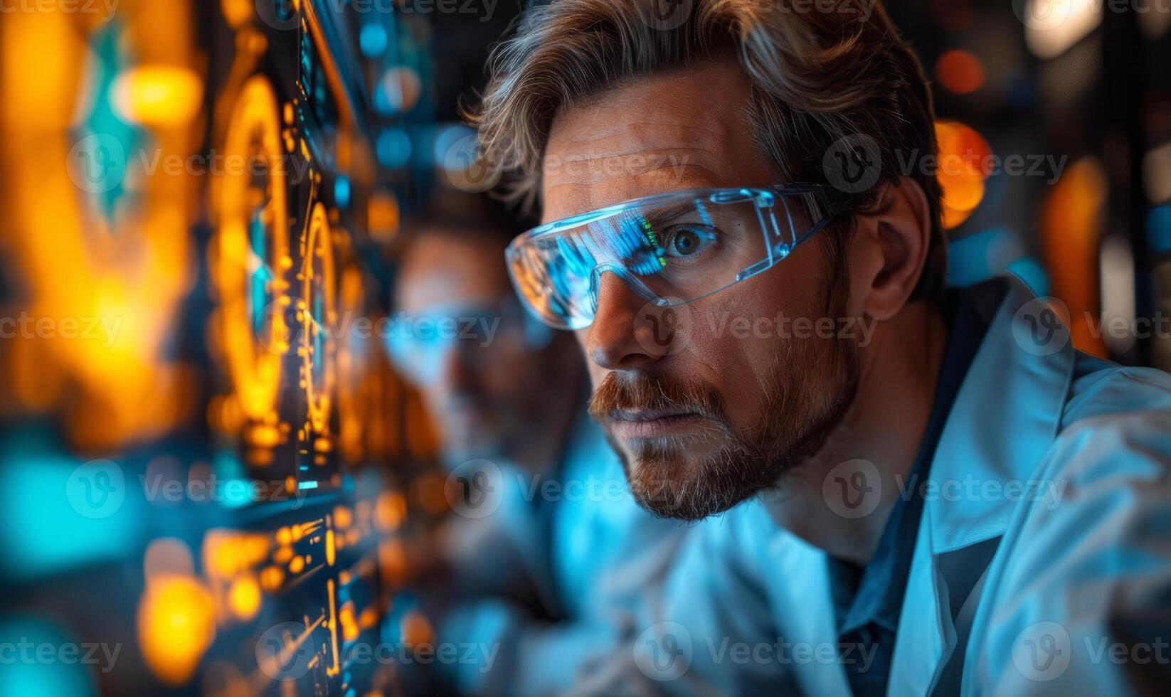 AI generated Man looks at screen in lab. Pair of scientists are studying computer screens in a laboratory Pro Photo