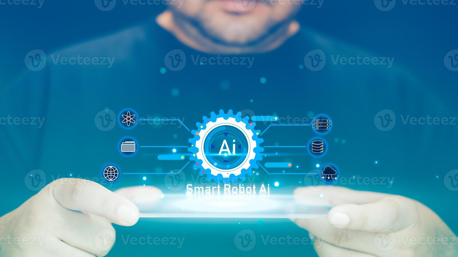 Men use artificial intelligence. Software technology AI to help and support work for chatbot, generate image Pro Photo