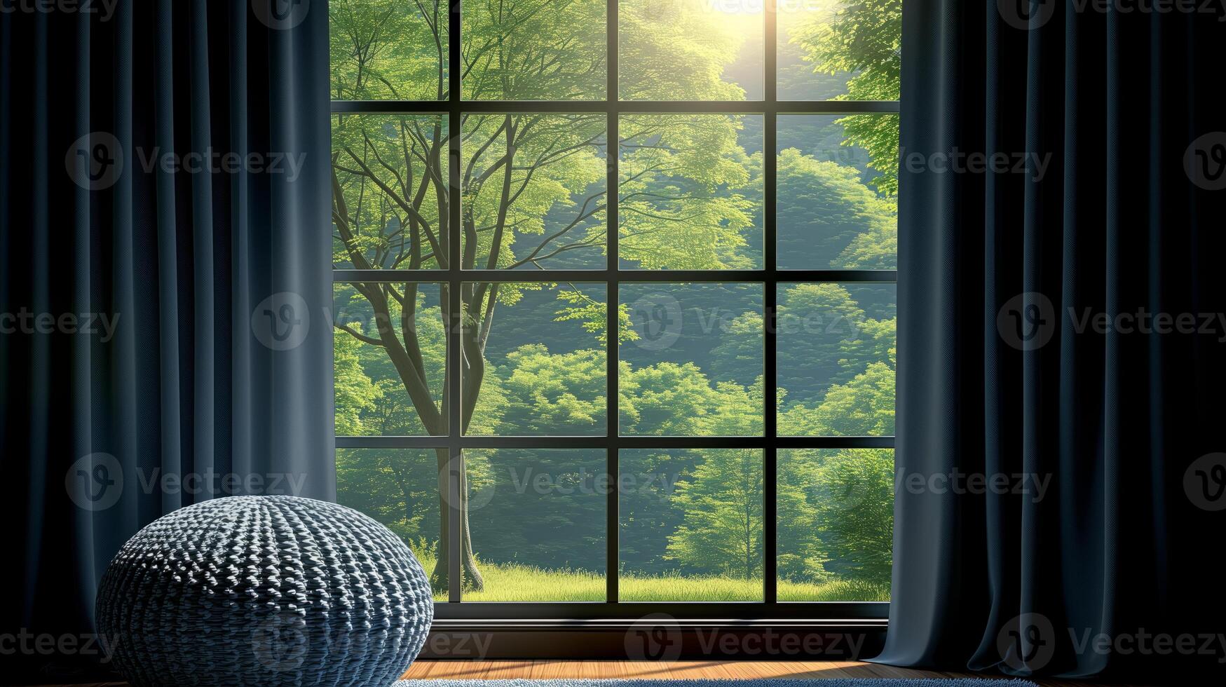 AI generated Serene morning view through a window with forest scenery Pro Photo