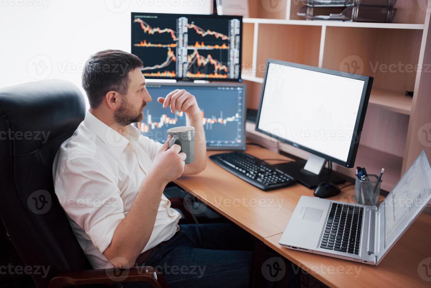Young businessman is sitting in office at table, working on computer with many monitors,diagrams on monitor. Stock broker analyzes binary options charts.Hipster man drinking coffee,studying Pro Photo