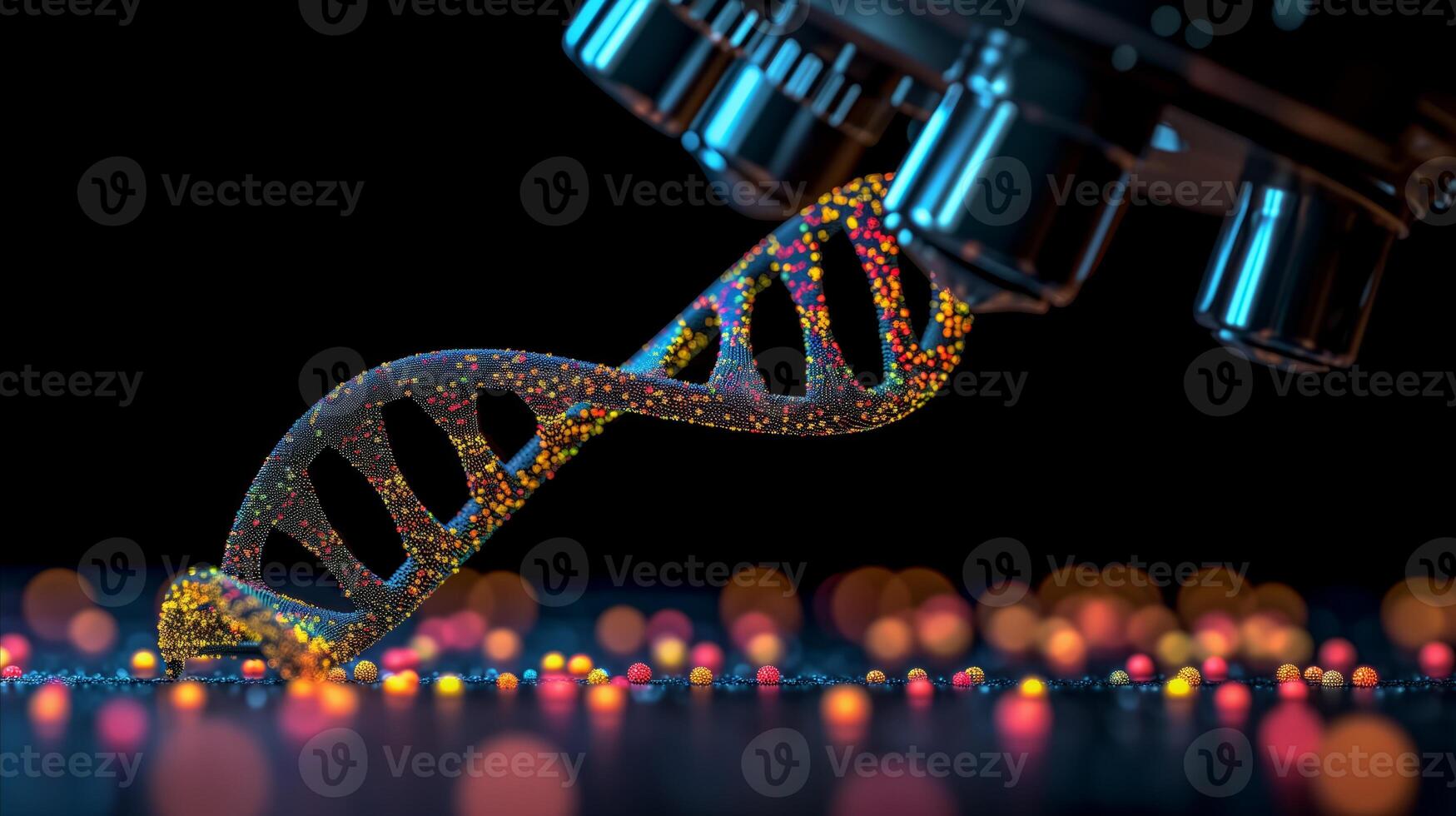 AI generated 3D DNA chain in front of a microscope. Background photo related to science and genetics. Pro Photo