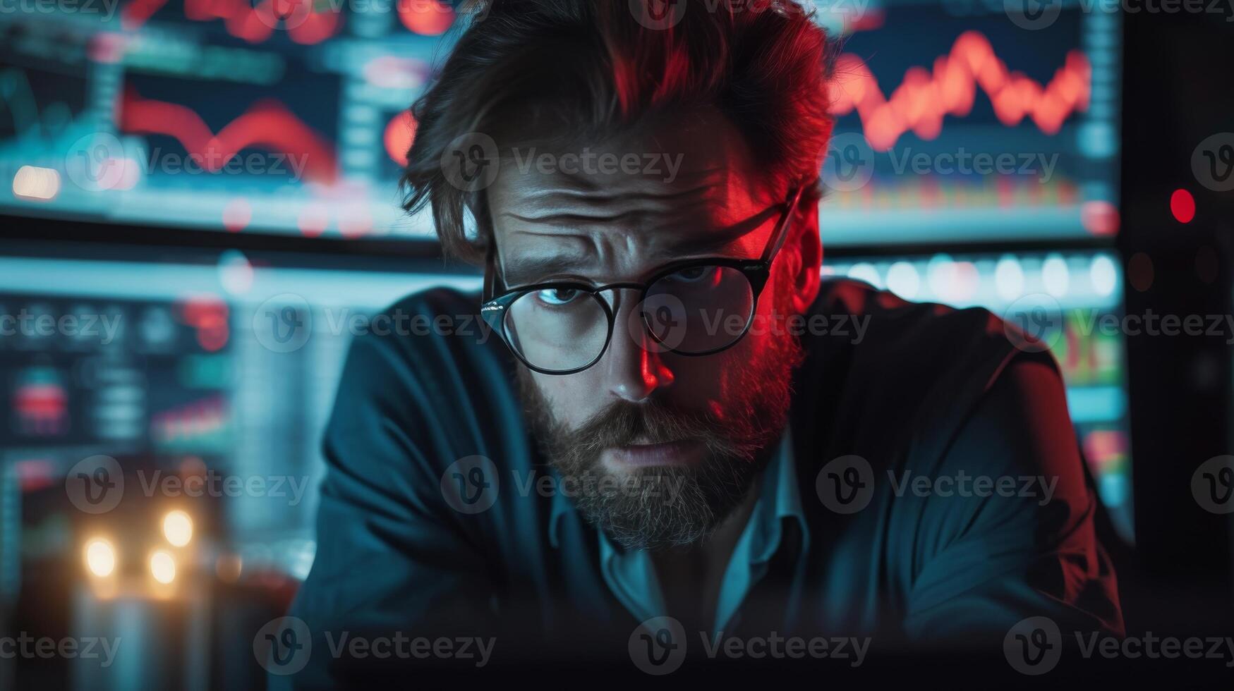 AI generated A Trader Staring at a Computer Screen with Red Graphs and Downward Arrow Pro Photo