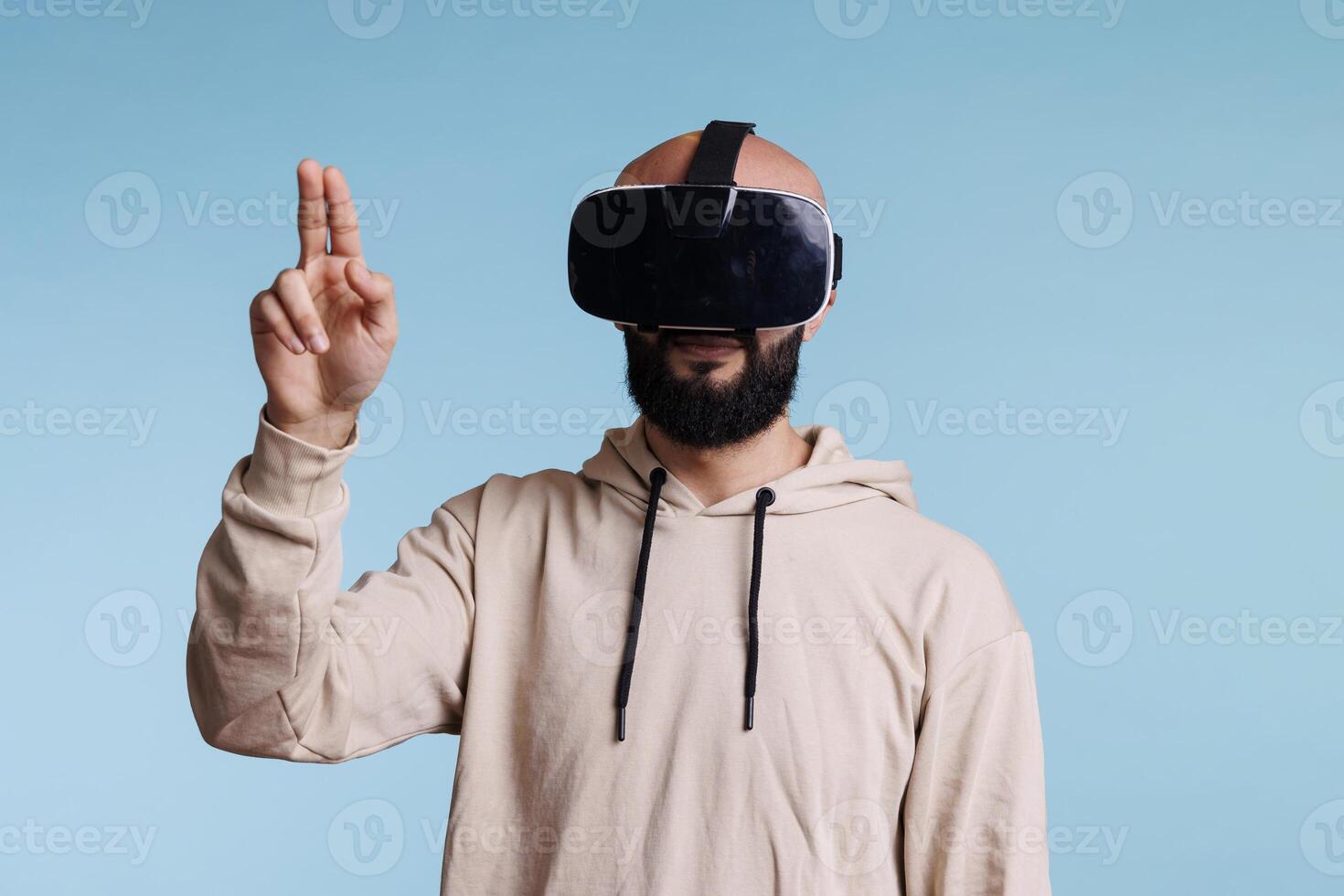 Young man in vr helmet making tap gesture with two fingers while exploring metaverse. Person in headset enjoying simulation activity and playing virtual reality games in cyberspace Pro Photo
