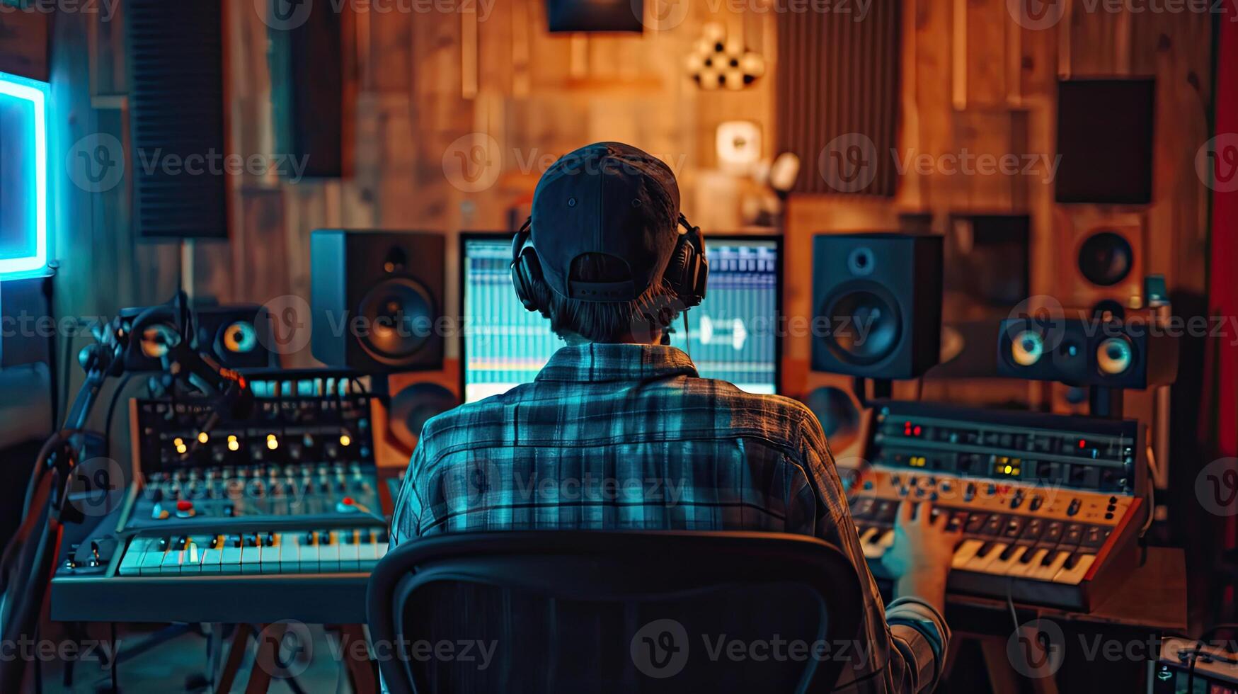 AI generated Back view of anonymous male audio engineer using computer while recording song of singer standing in studio Pro Photo