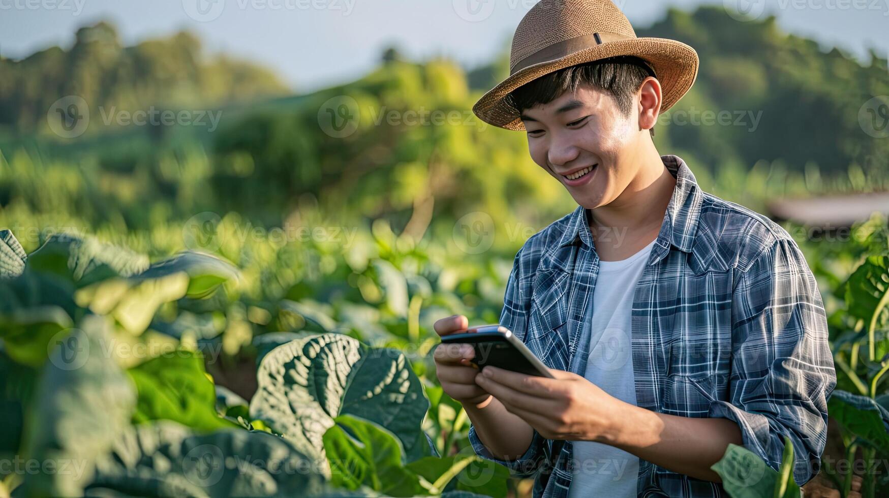 AI generated Agriculturist utilize the core data network in the Internet from the mobile to validate, test, and select the new crop method. Young farmers and tobacco farming Pro Photo