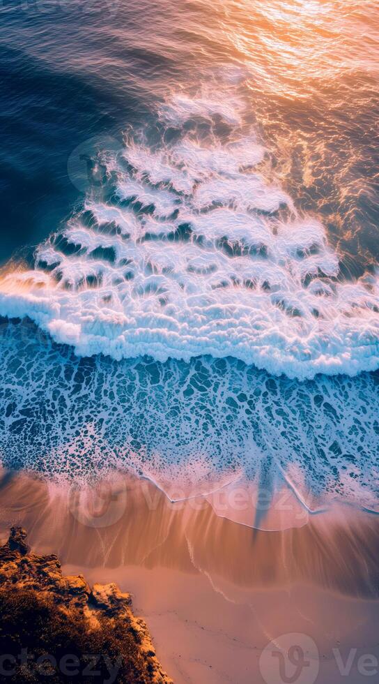 AI generated High angle of view of idyllic beach with foamy waves and empty space for text. Landscape top view image of paradise beach. Pro Photo
