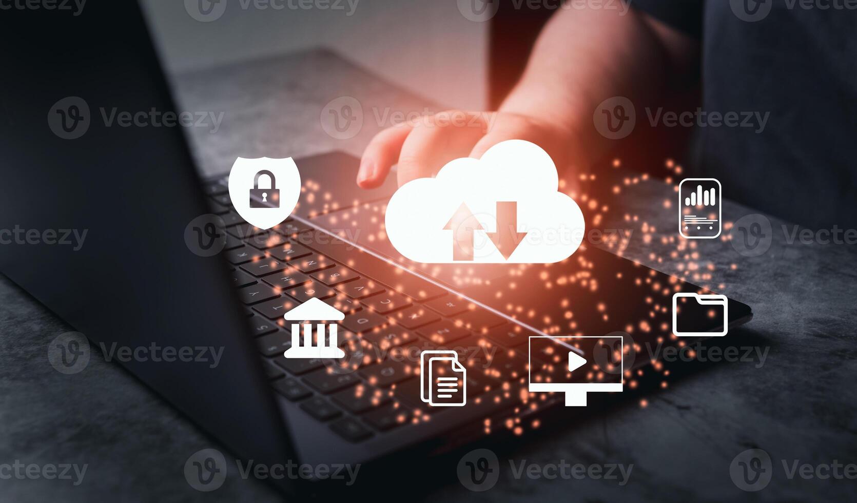 Woman use laptop with hologram interface of cloud computing diagram. Data storage concept. Networking and internet service. Pro Photo