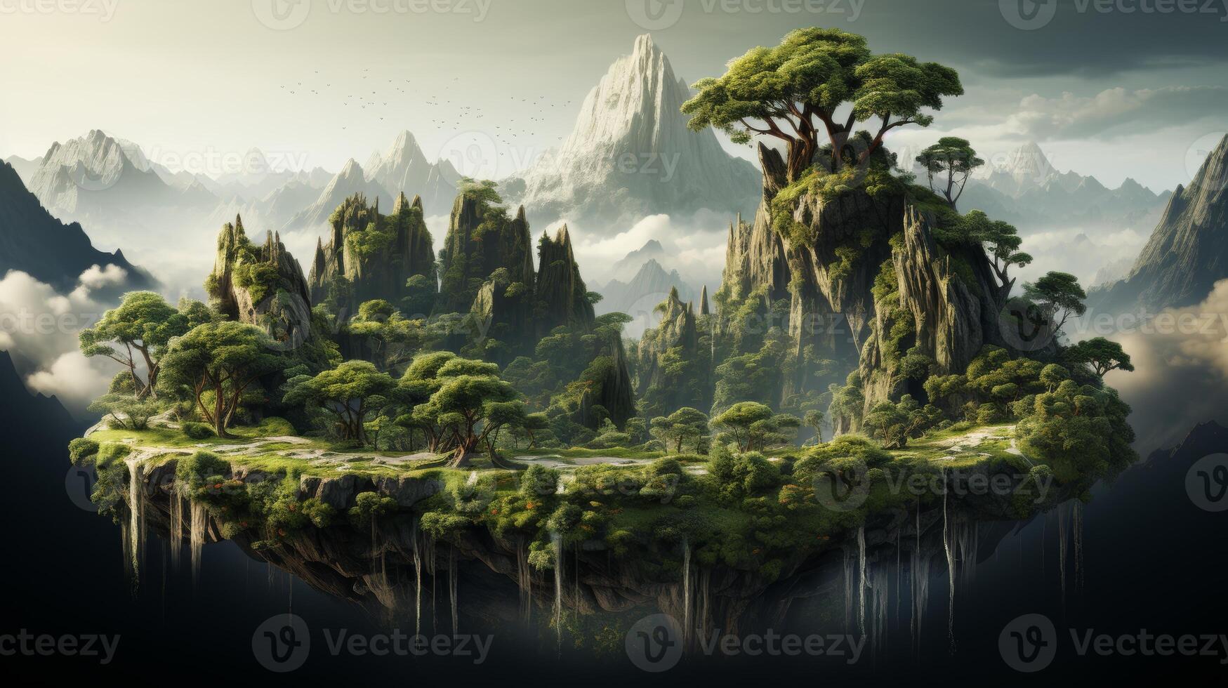 AI Generated A floating island with a beautiful landscape, green grass, waterfalls, and mountains, and a white background. It is depicted as a 3D illustration of a floating forest island. Pro Photo