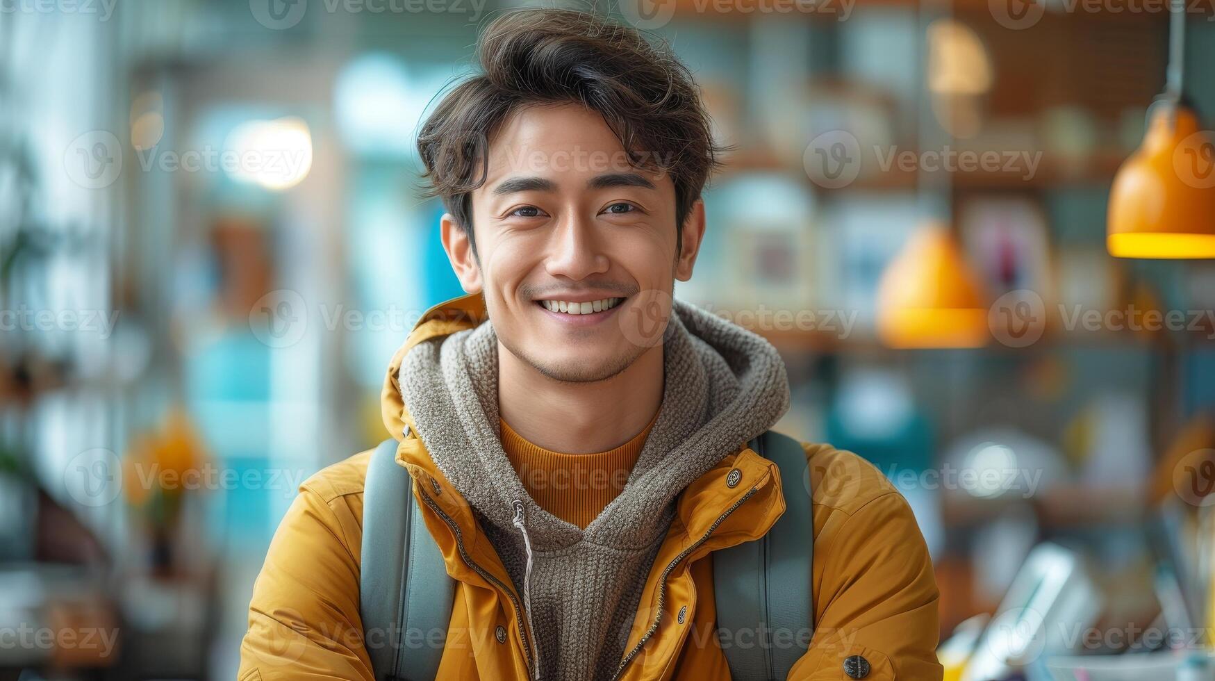AI Generated Number 1, phone and man isolated on blue background for online question, idea or decision on mobile app. Asian user pointing up on smartphone, internet or website. Pro Photo