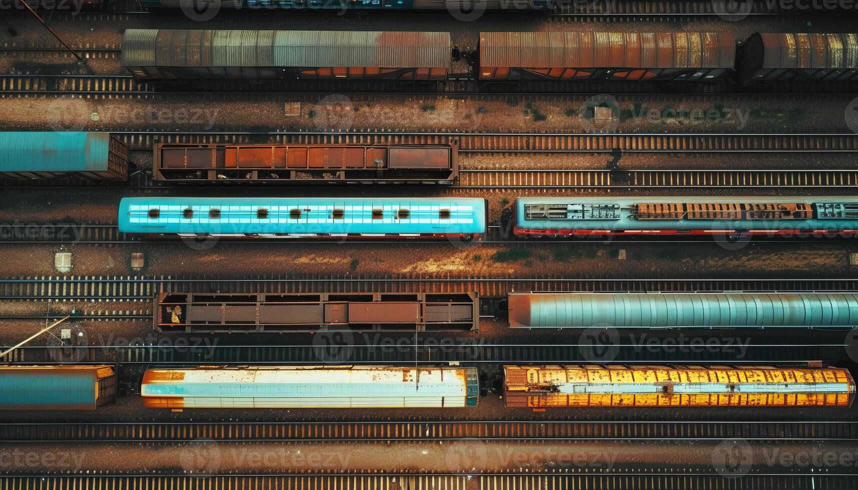 AI generated top view of horizontal rows of rails, on one of which there are train cars Pro Photo