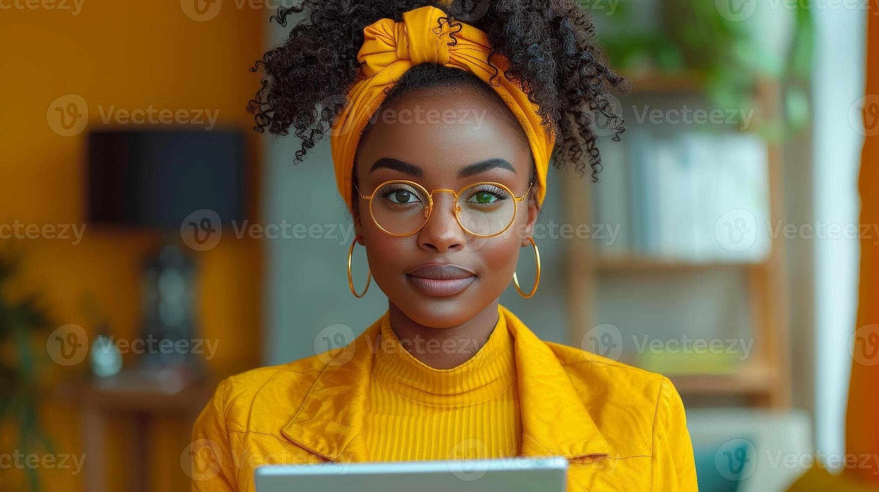 AI Generated Featured image is a young African woman holding a digital tablet isolated on a gray background, doing homework on educational websites, using useful applications, doing remote work on Pro Photo