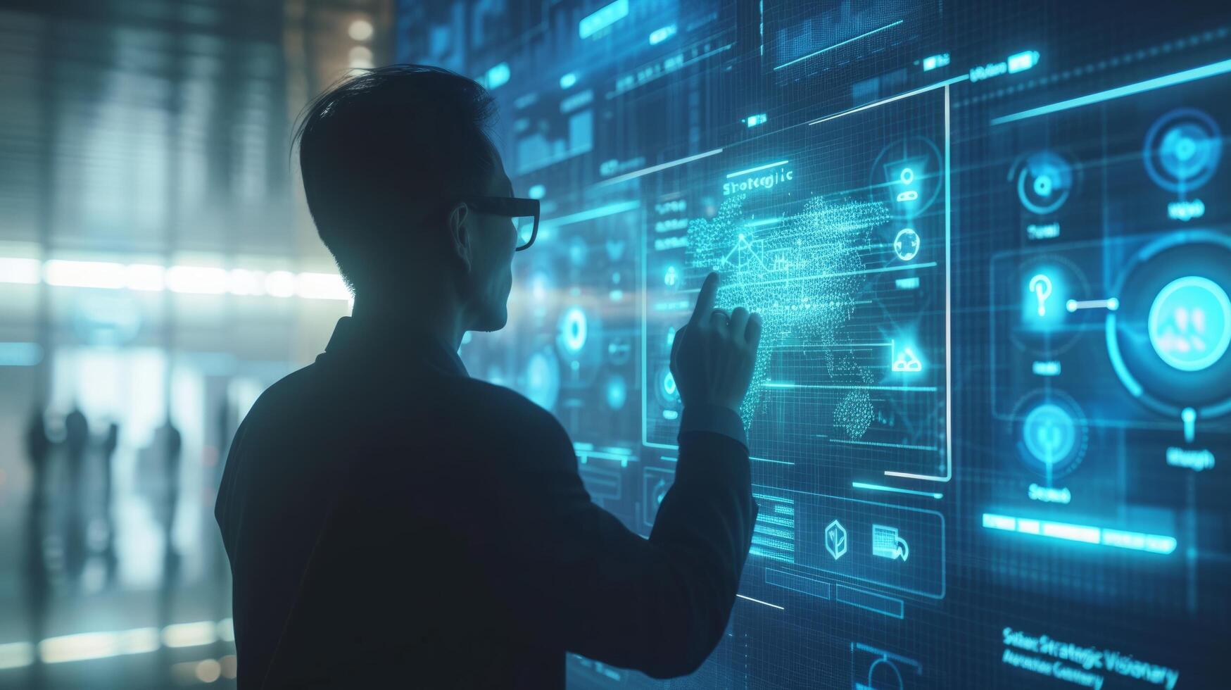 AI generated A CEO navigates a digital interface, leveraging AI analytics to craft a forward-thinking business strategy in a sleek photo