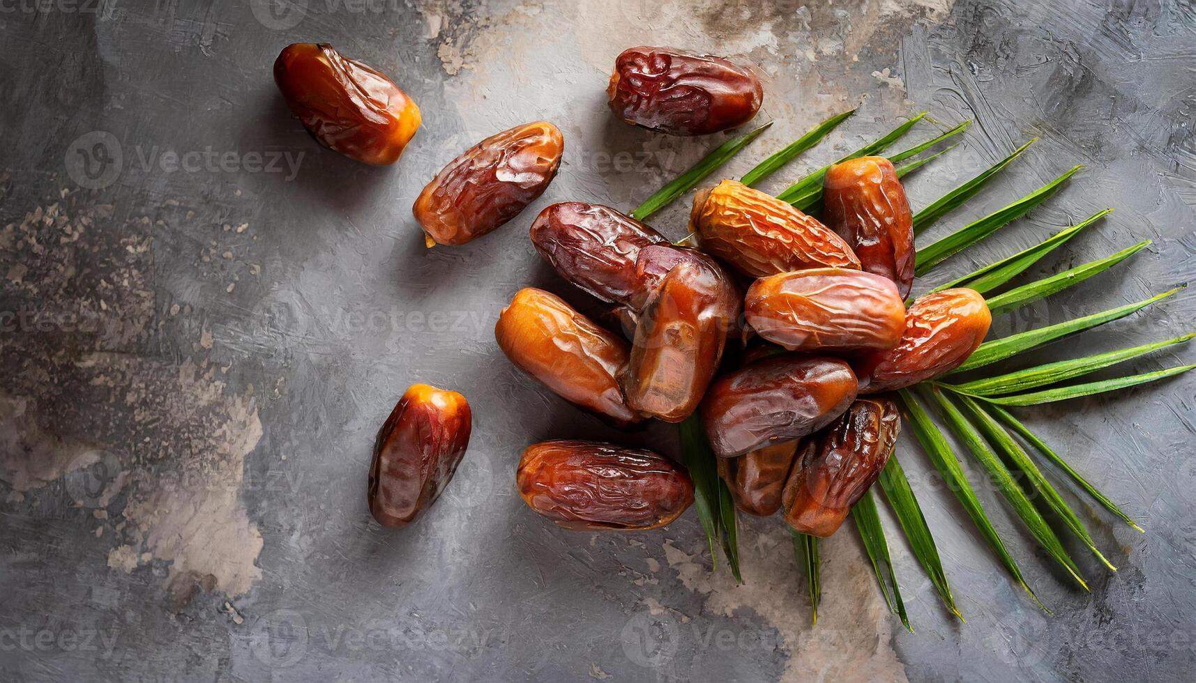 AI generated A top view of A cluster of glossy dates rests on a textured concrete grey surface with palm leaves, capturing natural and culinary aesthetics. Ideal for Ramadan themes, Flat lay. Pro Photo