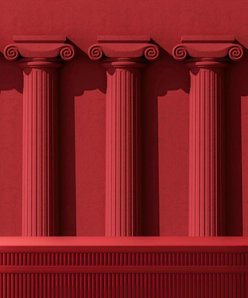 Red platform on a background of Roman concrete columns. Abstract background for product presentation. 3D rendering photo