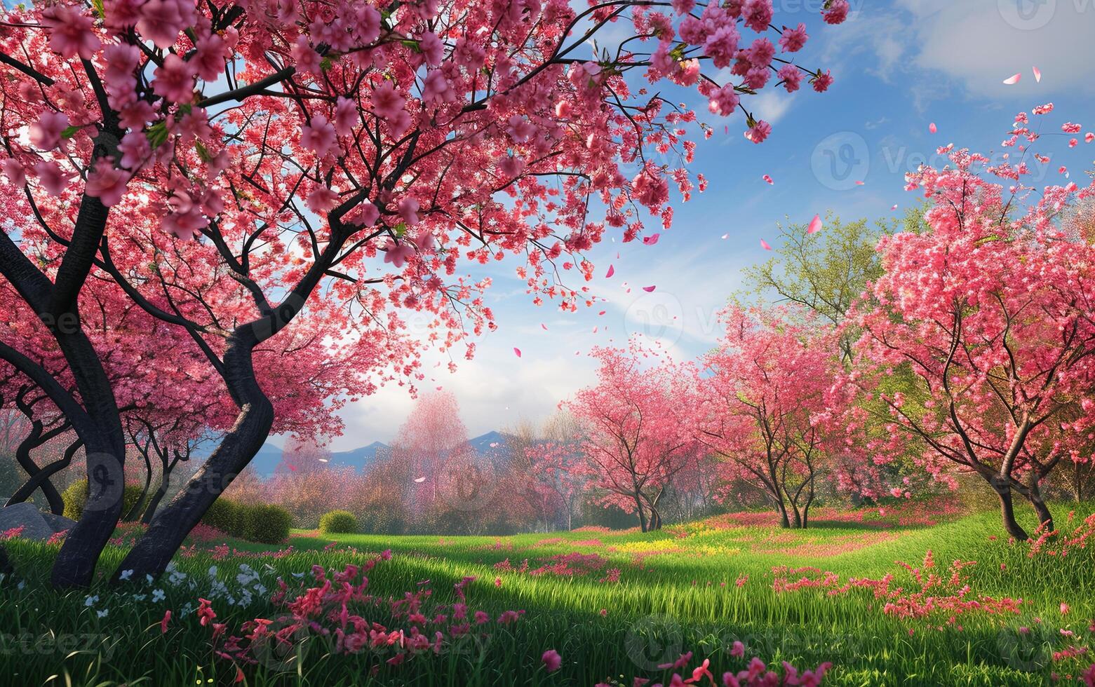 AI generated A beautiful cherry tree in full bloom, its tender flowers creating an enchanting display of nature's elegance Pro Photo