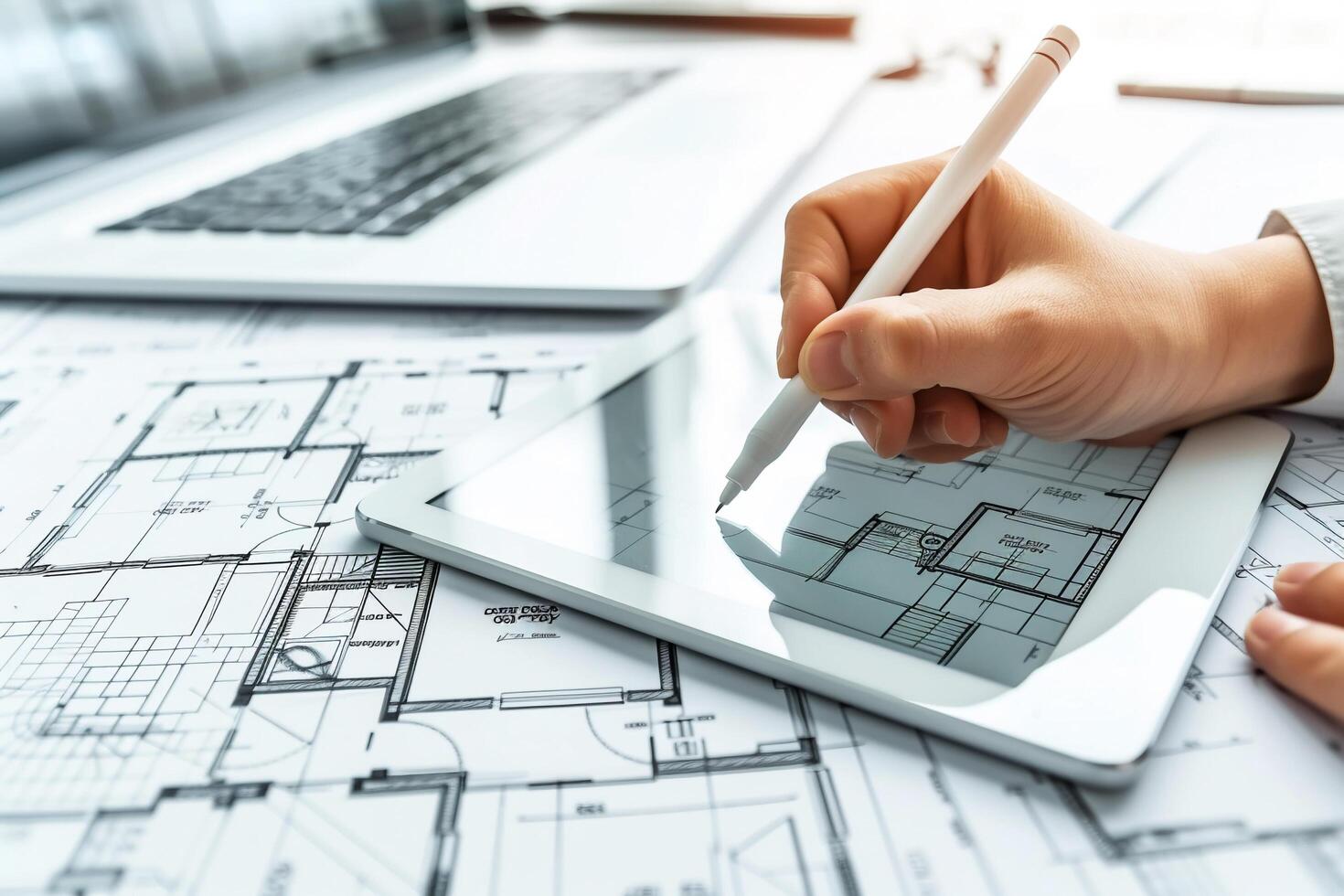 AI generated Architect working with blueprints and laptop computer. Free Photo
