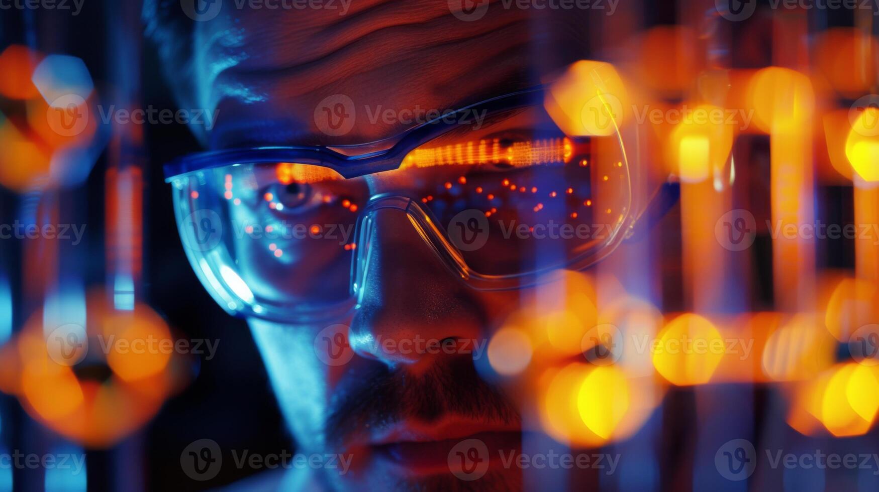 AI generated Intense focus on a digital display showing fluctuating chemical compound data, with a scientist's reflection on the screen, Pro Photo
