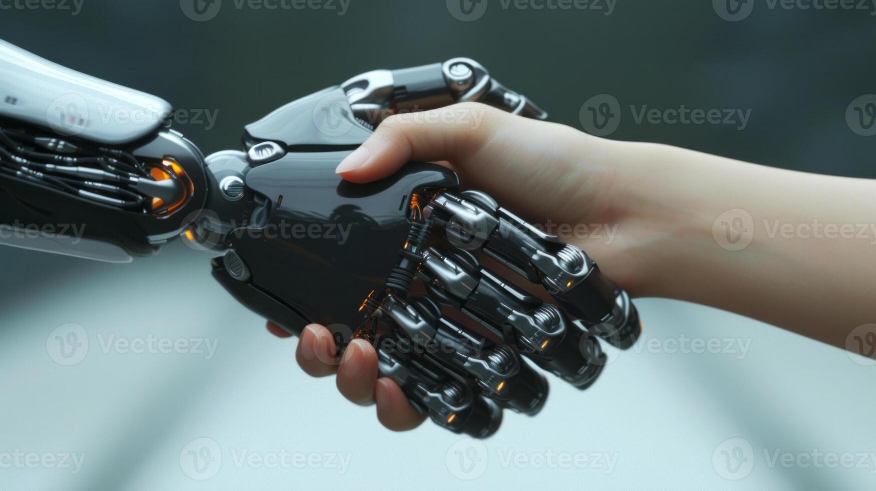 AI Generated AI robot handshake a human hand. Digital and human interaction in the futuristic digital age of advanced robotics and technology. Science and artificial intelligence. Pro Photo
