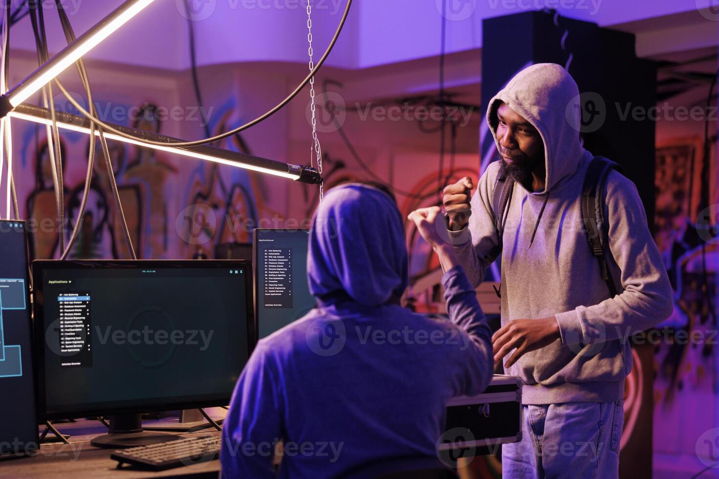 Hacker and crime partner exchange fist bump after successful cyberattack on server. Criminals making friendly gesture while breaking law and coding illegal malicious software in hideout place Pro Photo