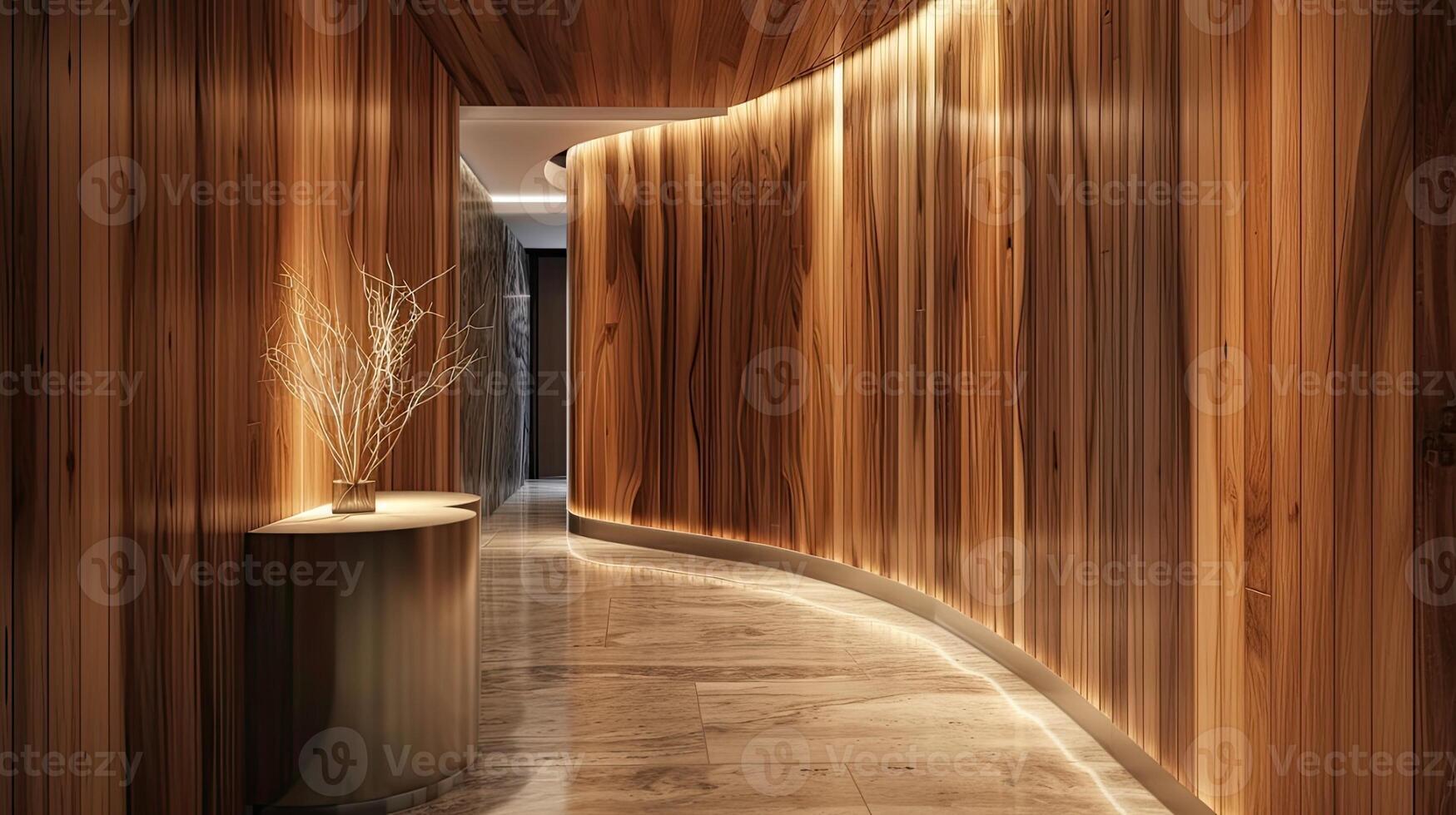 AI generated a carpentry wall surface structure design, enhanced by a glossy finish that accentuates the natural beauty and texture of the wood, creating a stunning visual focal point in any interior Pro Photo