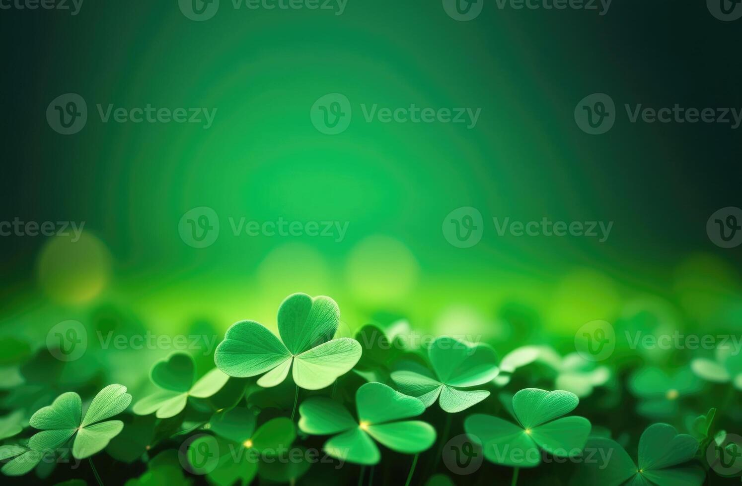 AI generated St. Patrick's Day, abstract green background, bokeh effect, golden glow, background with clover leaves, place for text, Irish shamrock Pro Photo