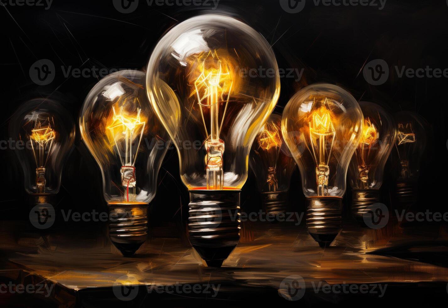 AI generated A paper lightbulb lit on a blackboard. A group of light bulbs is arranged neatly on top of a table, creating an organized display. Pro Photo