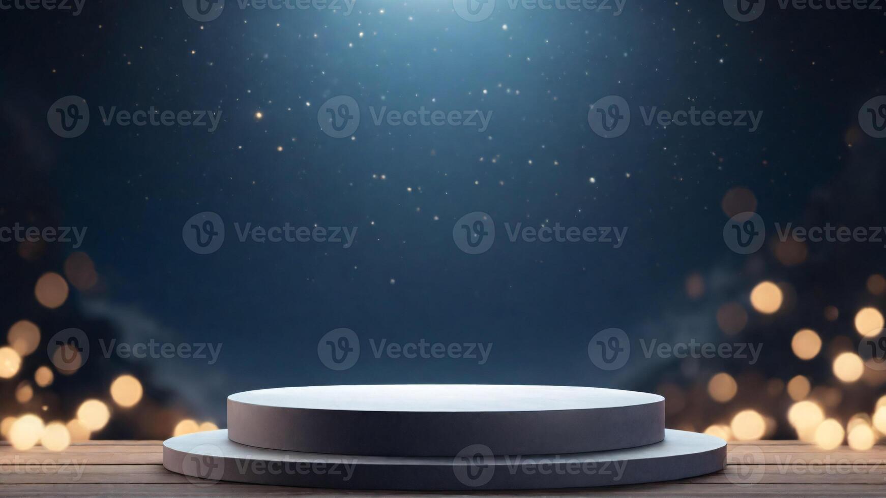 AI generated Black podium on wooden table and bokeh light background. 3d render Pro Photo