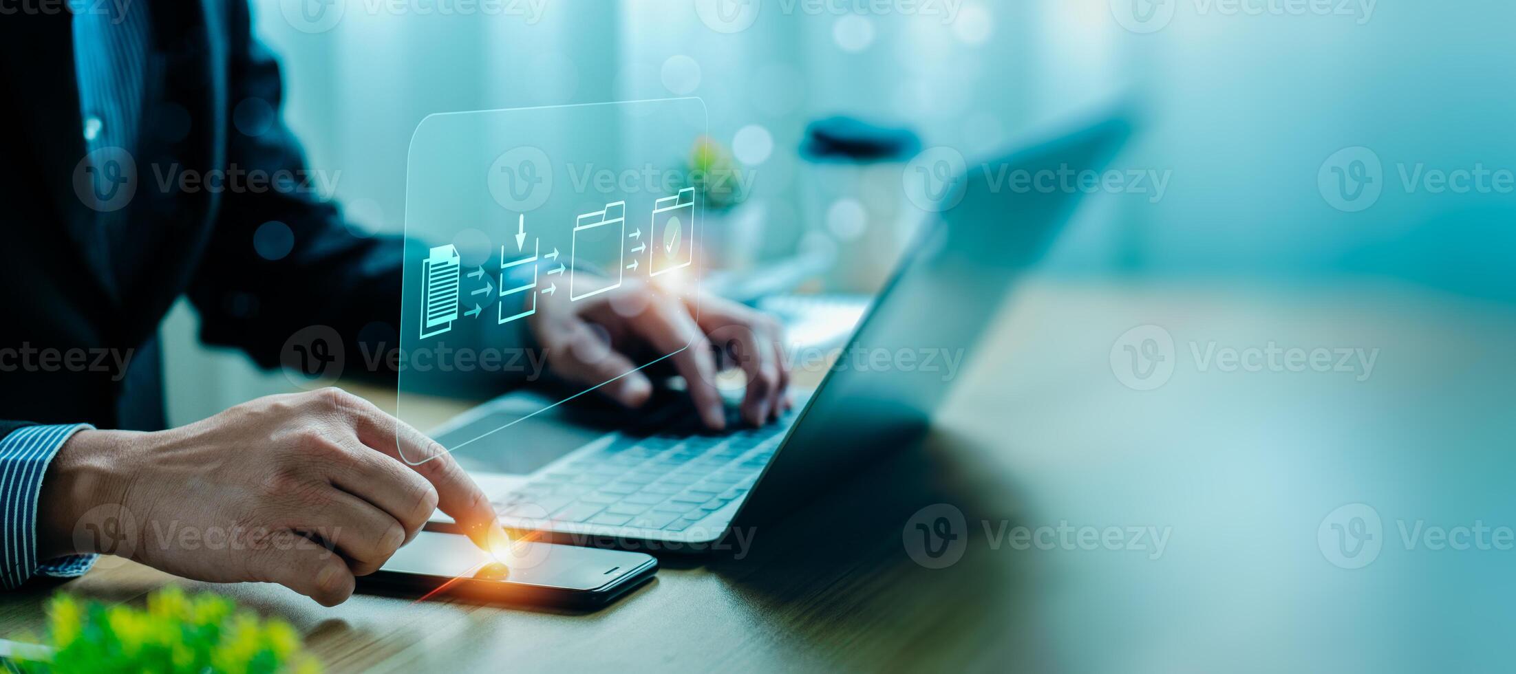 Document Management System concept. Enterprise content management, Digital asset management, Document imaging, Workflow, Records management, Online document file data software for efficient archiving. Pro Photo