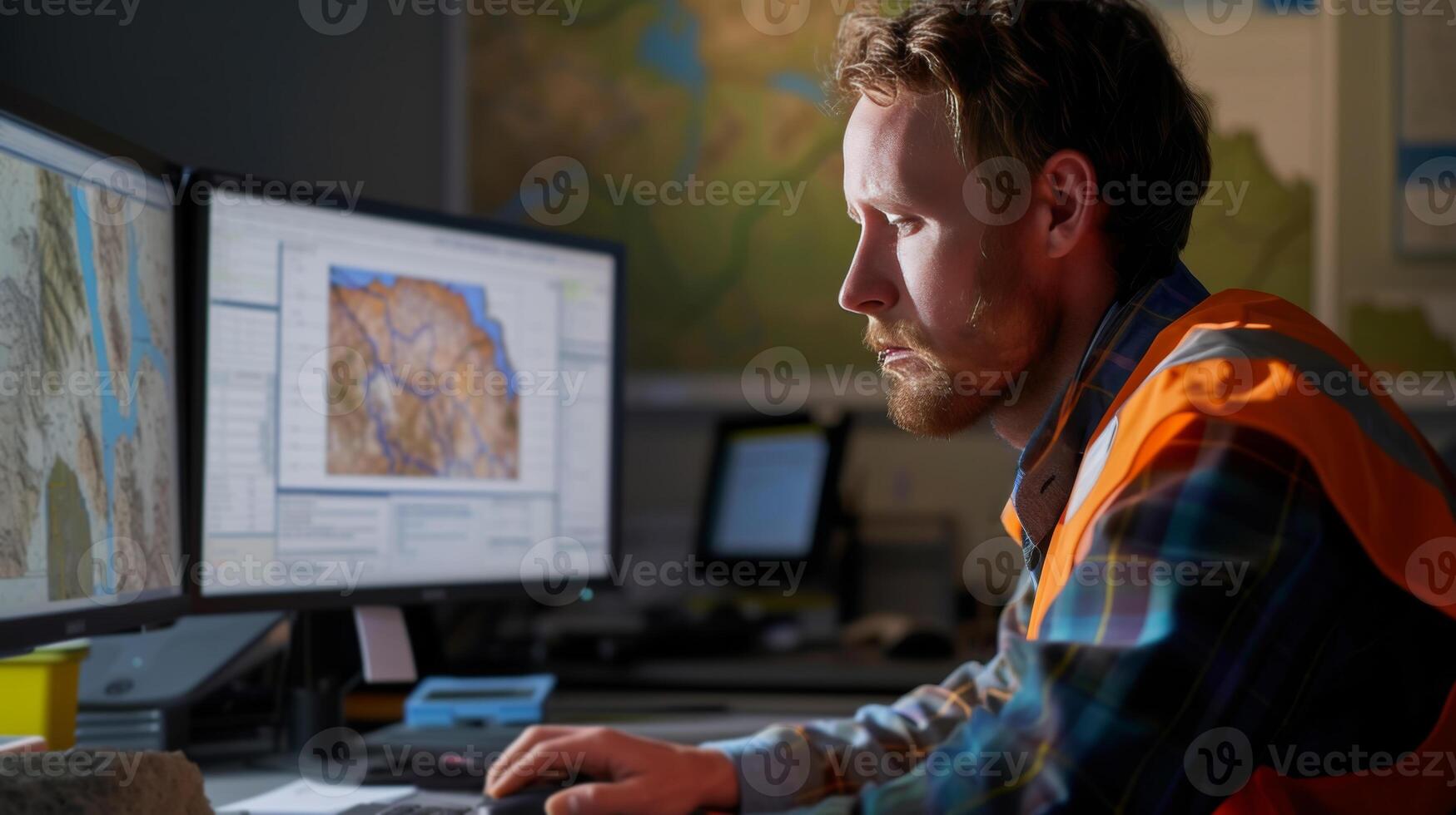 AI generated Computer Screen with Geological Data and Maps on Engineer Desk with Rock Samples Pro Photo