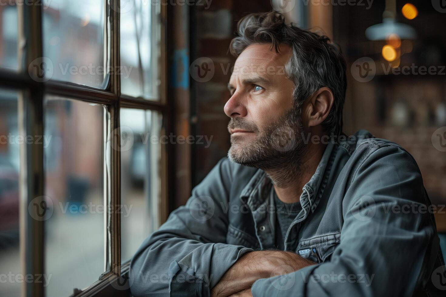 AI generated A man sits in a coffee shop, looking out the window with a thoughtful expression, pondering various things Pro Photo