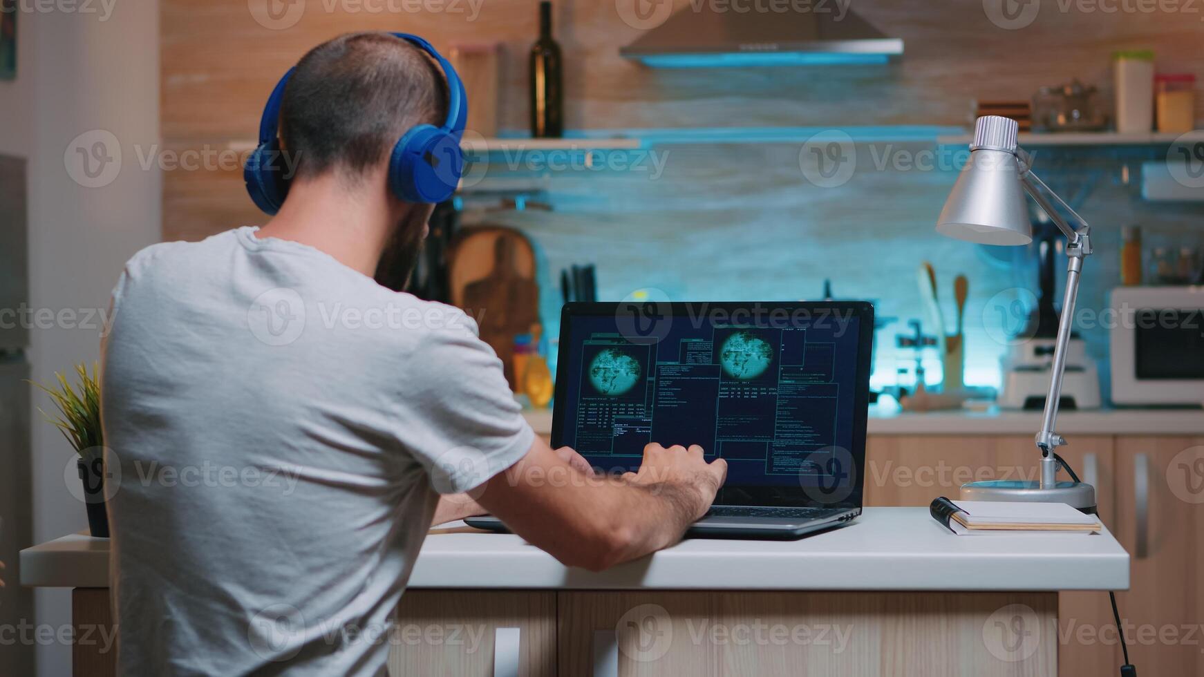 Back view of hacker with headset attacking succesfully the government using finetech, working from home in midnight. Programmer writing a dangerous malware for cyber attacks using performance device Pro Photo