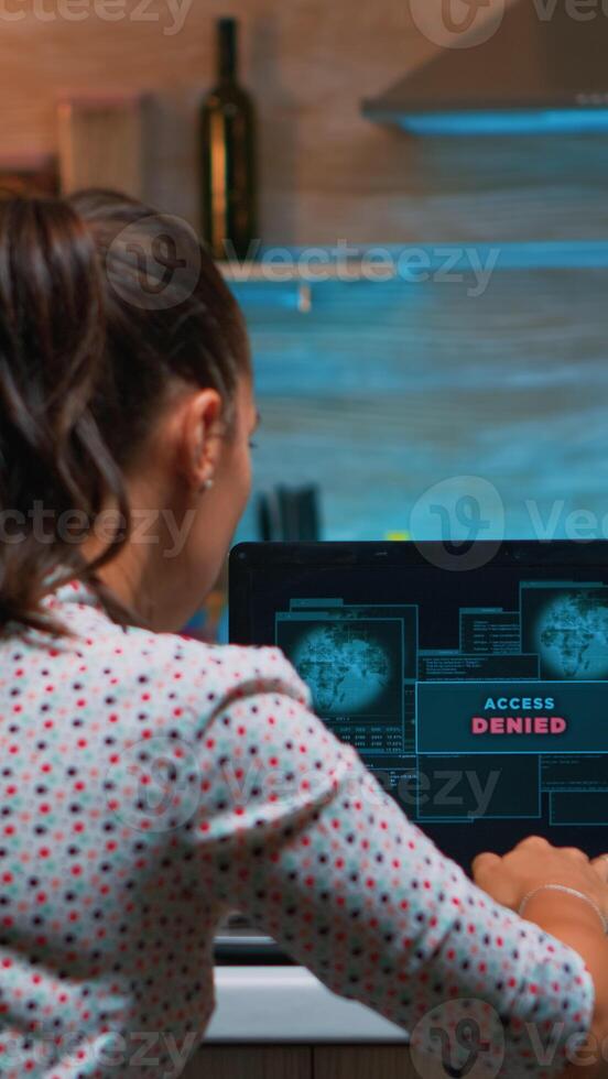 Hacker failing matching password and nervously closing laptop in midnight. Woman programmer writing a dangerous malware for cyber attacks using performance computer late at night. Pro Photo