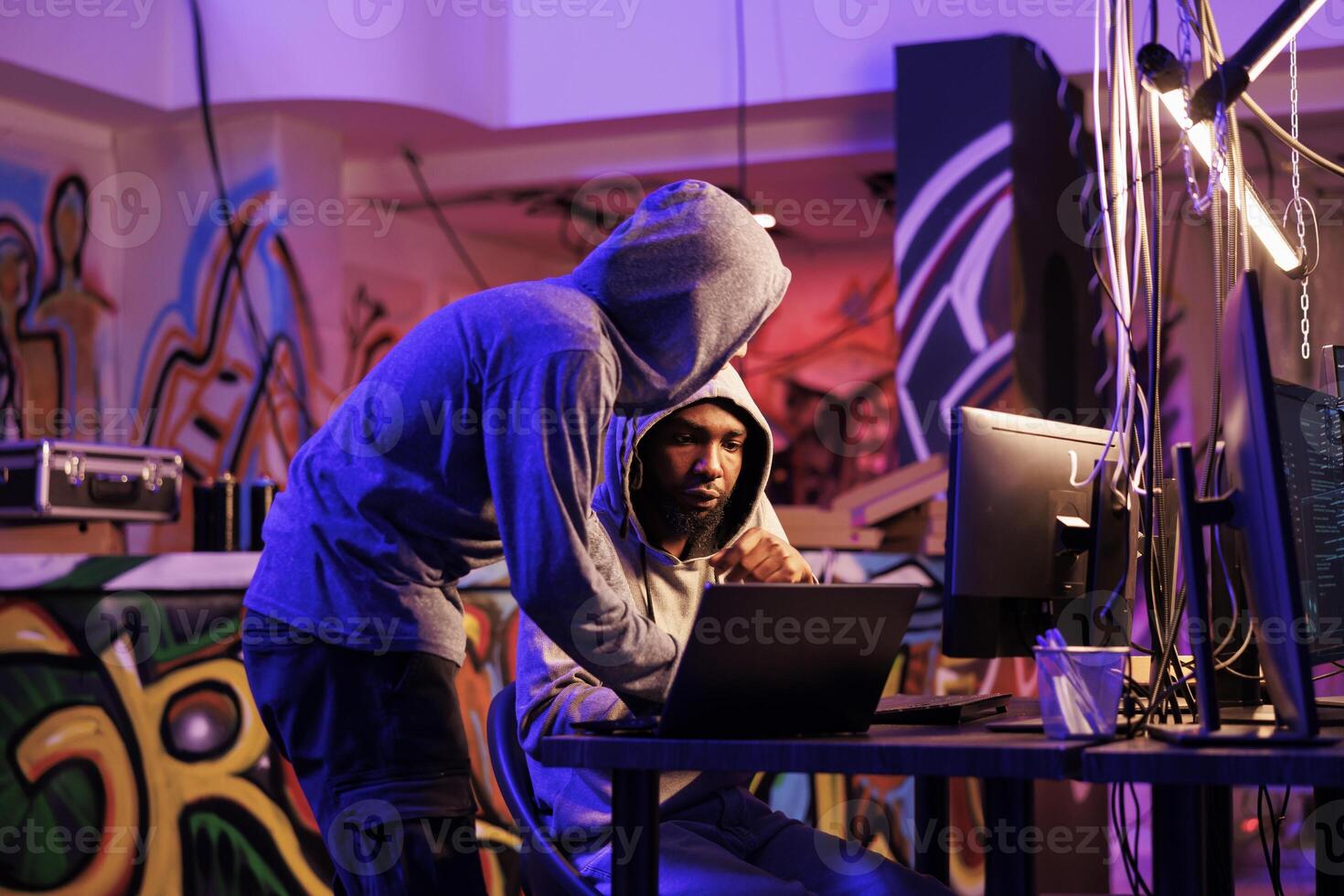 Criminals hacking on laptop together and planning ddos attack on website. Two hackers in hoods checking malcious software code on portable computer in abandoned warehouse Pro Photo