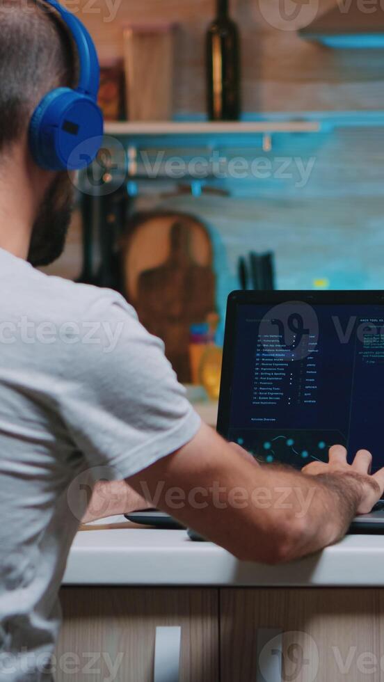 Male hacker typing on keyboard a dangerous malware to steal from government server wearing headset, working from home. Programmer writing a dangerous malware for cyber attacks during midnight. Pro Photo