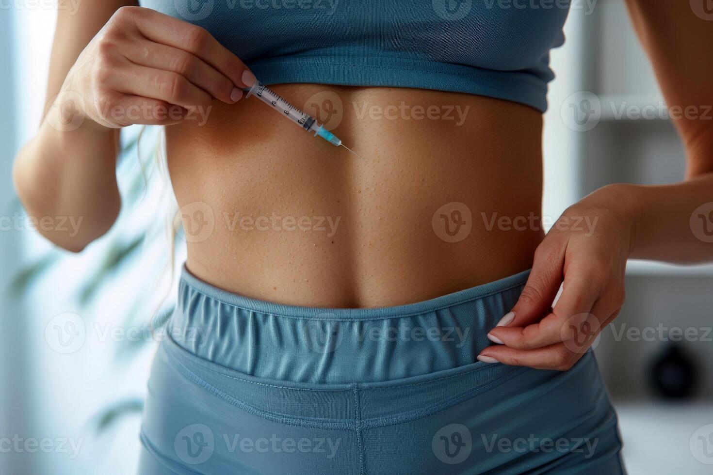 AI generated diabetic patients hand holding an insulin syringe while injecting on belly on solid white background. ai generative Pro Photo