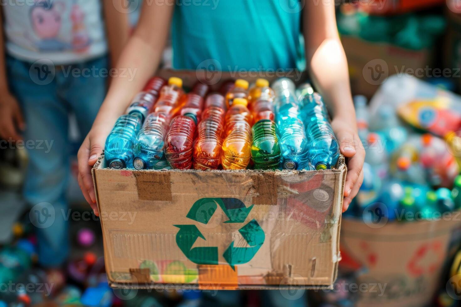 AI generated hands holding a recycling box filled with various recyclable items on beach ..Environment Day concept. Generative AI Pro Photo