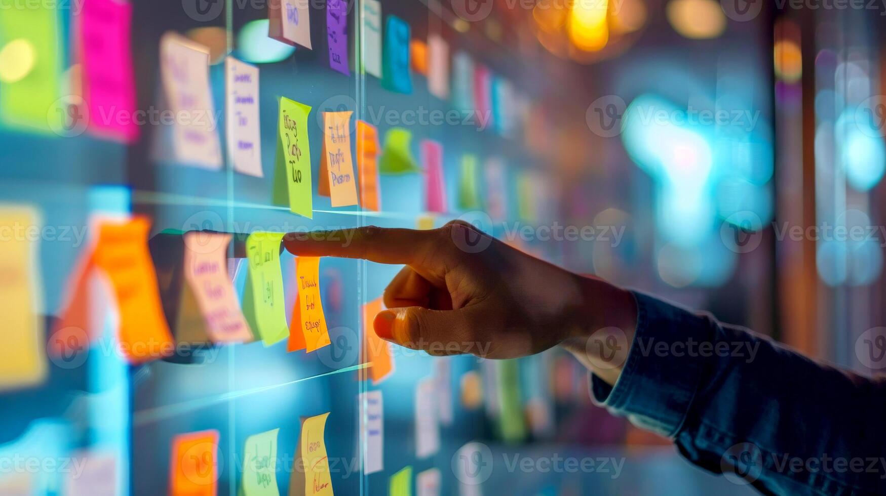 AI generated Agile software development scrum methodology boards. workflow, Finger touching virtual interface.AI generative Pro Photo