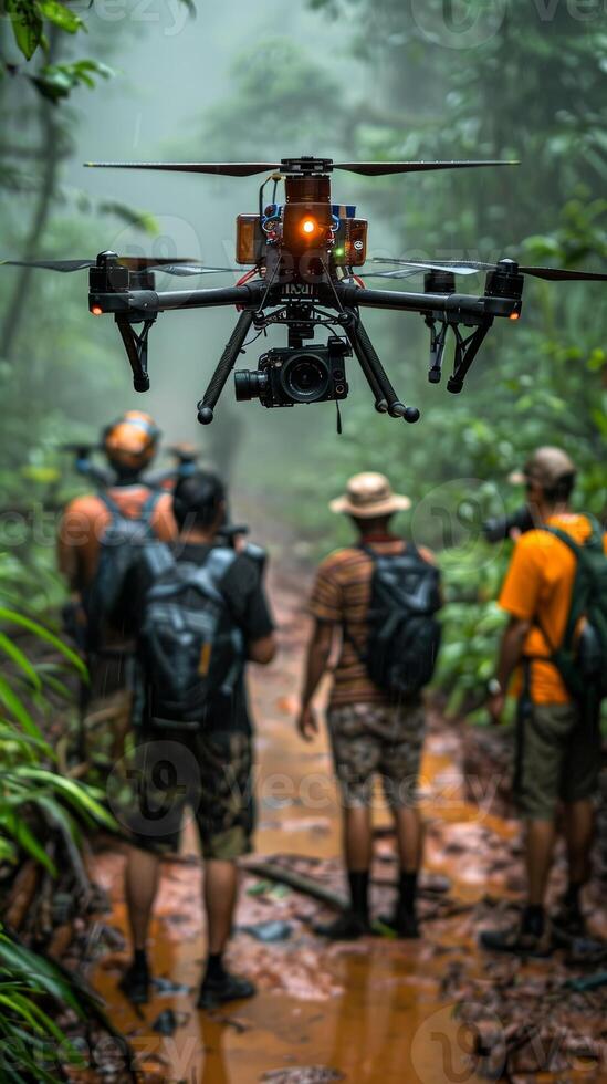 AI generated Rainforest conservation team using drones to monitor deforestation, combining technology and conservation efforts. Pro Photo